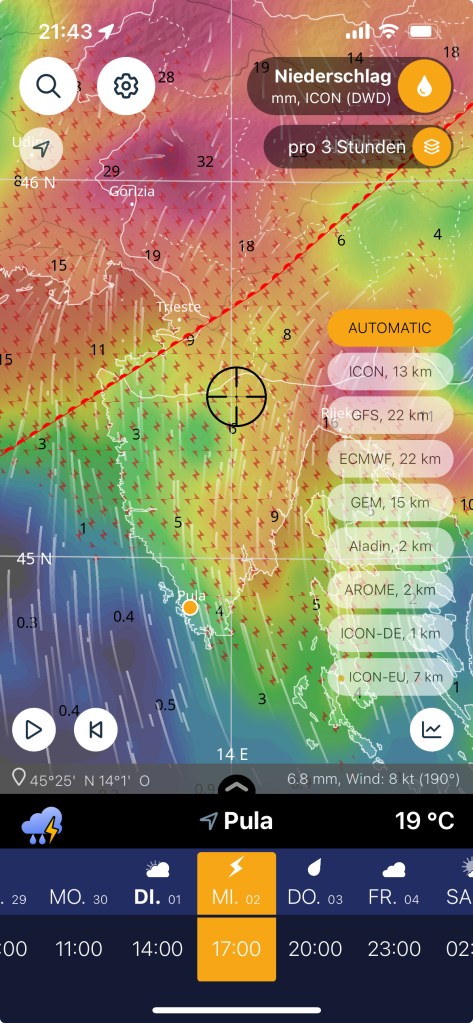 Des weiteren sah schon gestern die Wetterprognose nicht berauschend aus. Für morgen Mittwoch ist eine Gewitterfont über ganz Istrien prognostiziert. Daher haben wir gestern schon entschieden, heute den Vormittag für die Windsteuerung zu verwenden und dann noch Zeit mit unseren Liebsten zu verbringen.
