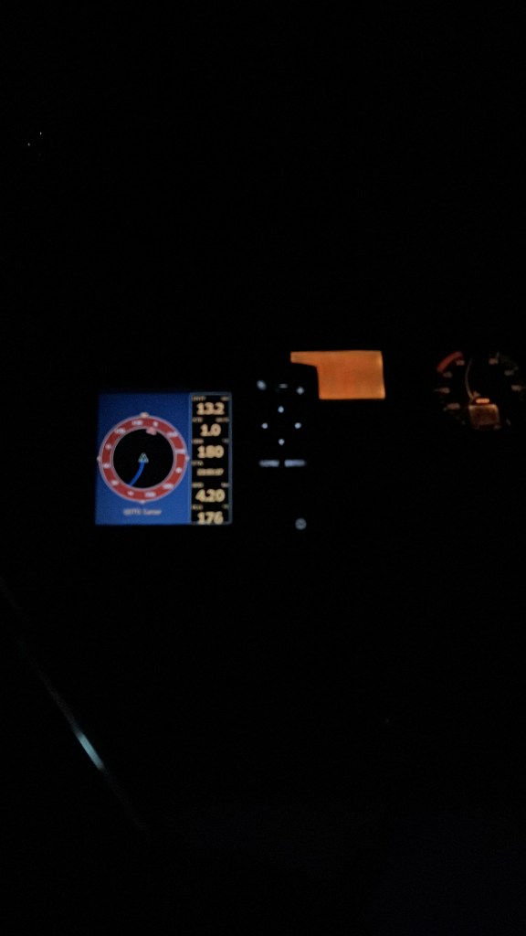 Somit bezog ich den Platz am Navigationstisch. Manu war am Steuer und folgte dem elektronischen Kompass sowie dem normalen Kompass, je nachdem, was ich ihr über das Walkie Talkie durchgab. Da der Motor lief waren diese Geräte Gold wert. Obwohl Manu nur wenige Meter von mir entfernt draußen am Steuer stand, war der Motor zwischen uns und somit eine Verständigung schwierig. Im Bild rechts seht ihr unseren kleine Plotter im Cockpit mit der Steueransicht auf den Waypoint zu. Leider ist die Beleuchtung des Hauptkompasses ausgefallen, so haben wir uns mit einem Partyknicklicht ausgeholfen.