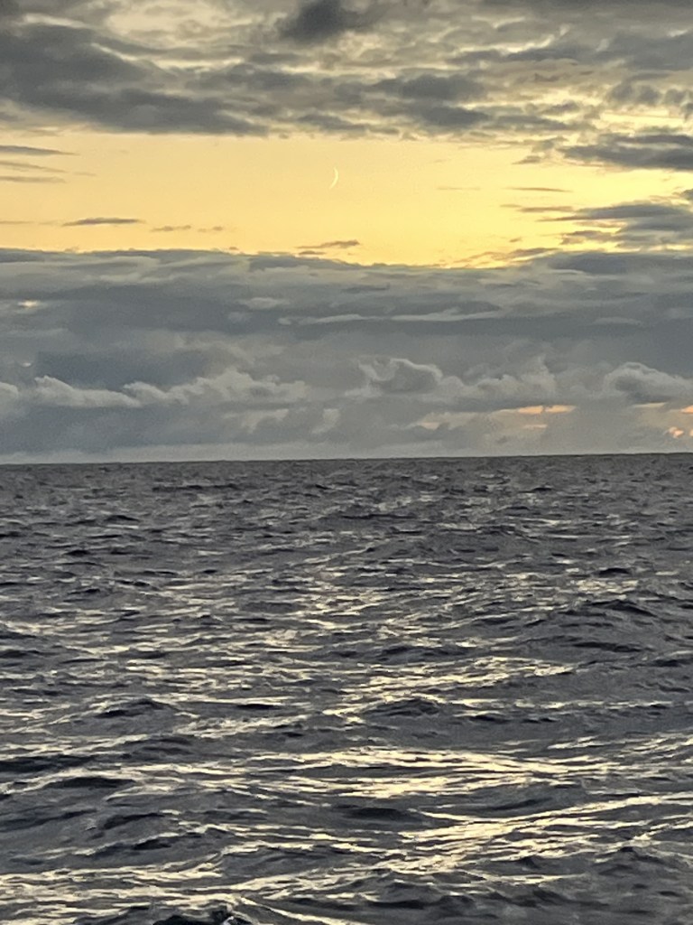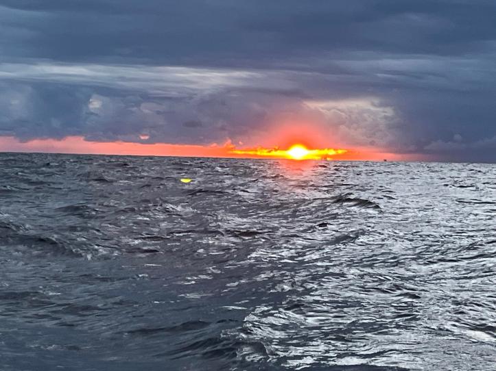 Jetzt kam die Zeit der sogenannten Hundewache. Das ist die Zeitspanne vor dem Morgengrauen, wenn die Nacht am Dunkelsten und Kältesten ist. Wenn du gar nichts von draußen siehst, weil es finster ist und die Wolken kein Licht durchlassen, fühlt sich das schon ein wenig entrisch und surreal an. Doch dann kommt ein ganz besonderer Moment, nämlich der, wo es langsam dämmert. Je heller es wird umso größer wird die Zuversicht, dass alles gut wird. Und dann ist er da, der großartige Moment, wenn die Sonne über den Horizont steigt.