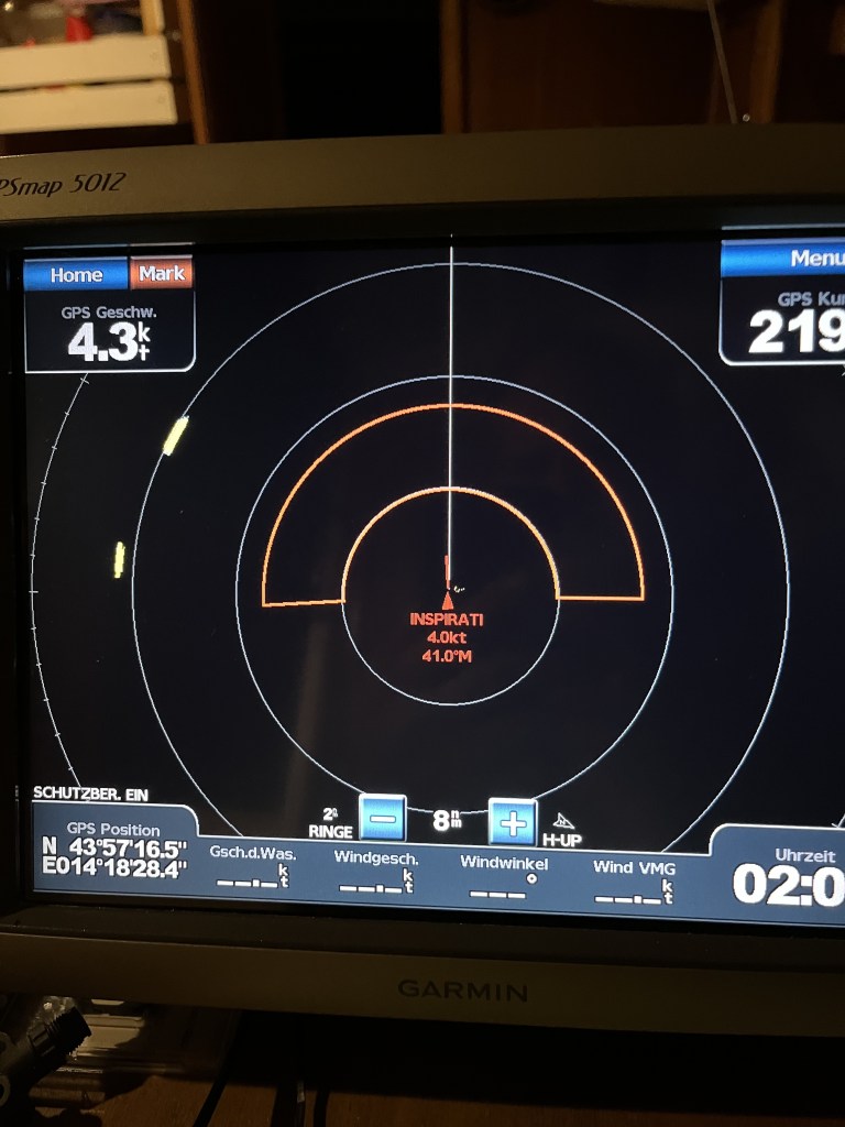 Die Wetterprognose sah vor, dass wir ruhiges Wetter bis in die Mitte der Adria haben würden und dann Wind von Nordwesten und ein bewegtes Meer einsetzen würde, was in der Realität dann auch so war. Unter Maschine fuhren wir in unsere erste längere Nachtfahrt, natürlich hatten wir uns darauf vorbereitet.
