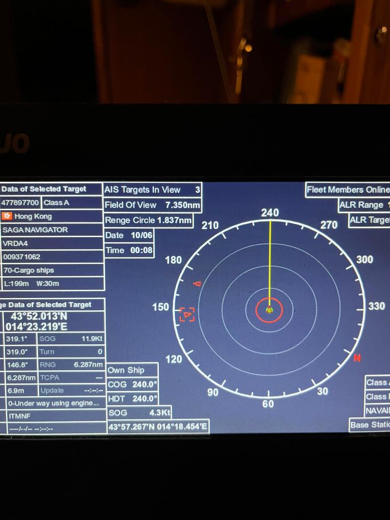 Schließlich kamen wir wirklich in den Verkehr, umringt von Tankern und Frachtern. Je nach Position überlegte ich mir einen Ausweg und gab Manu über Funk den zu steuernden Kurs durch. Obwohl wir das noch niemals zuvor gemacht haben, stellte sich heraus, dass wir ein tolles Team sind. Manu setzte meine Angaben sofort und genau um, was in dunkler Nacht auf welligen Terrain gar nicht so einfach ist. Als wir in mitten mehrerer Schiffe waren, fand ich, so dachte ich mir zumindest, eine gute Lösung und war sehr zurfieden mit mir. Bis dann das Kreuzfahrtschiff „Costa Deliziosa“ auf dem Schirm erschien, mit 20 kn Fahrt (20kn sind 37 km/h, auf dem Wasser ist das schon ganz schön schnell, vorallem wenn man sich selbst mit nur 4kn bewegt), genau auf uns zu.