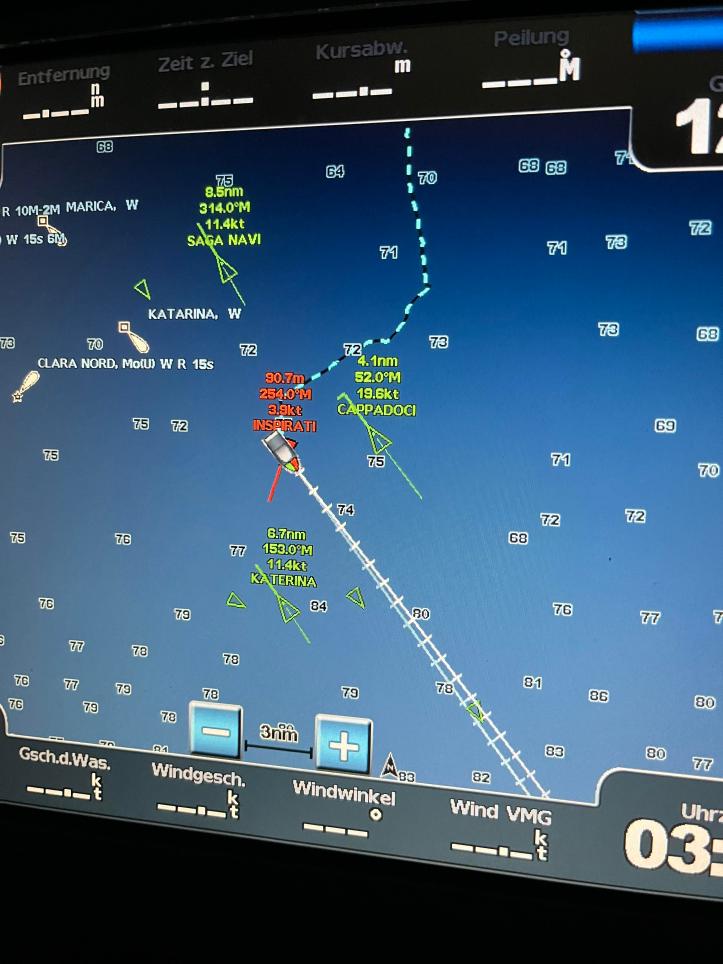 Um ca. Mitternacht erreichten wir unseren Wegpunkt. Mit der noch lebendigen Hoffnung dass wir dem größten Verkehr entkommen würden, übergab ich Manu das Steuer und ging unter Deck, in der Erwartung mich ein wenig ausruhen zu können. Wir haben zwar eine super tolle Windsteuerung an Bord, aber ohne Wind läuft die nicht, bzw. wenn wir unter Motor fahren ebenso nicht. Da wir uns entschieden hatten die erste Nachtfahrt unter Motor zu fahren mussten wir abwechselnd „Ruder gehen“, immer für einige Stunden am Stück. Einige Minuten später, fragte Manu, ob ich was am Radar hätte, denn sie habe rote und weiße Lichter Backbord querab (linke Seite des Bootes, 90° Winkel). Der Blick aufs Radar offenbarte, dass Einsamkeit nicht aufkommen würde.