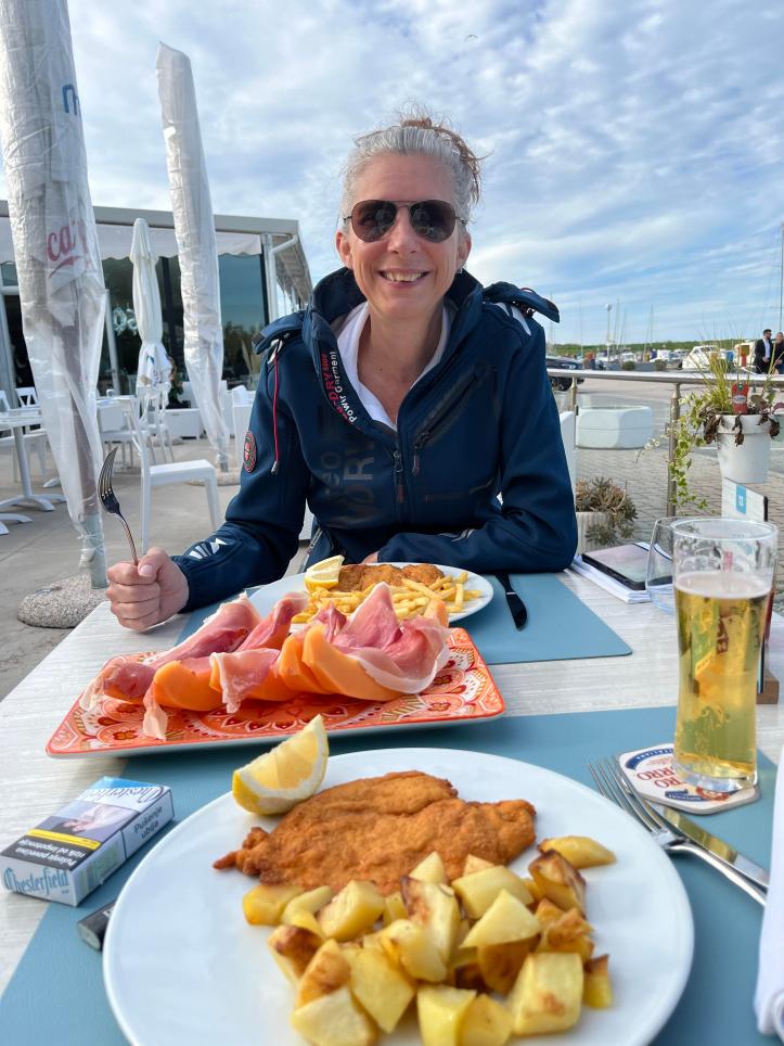 Fest am Kai vertäut lassen wir die Inspiration, die uns sicher über die Adria gebracht hat für einige Zeit zurück und gehen zum Essen in das zur Marina gehörende Restaurant. Obwohl die Küche eigentlich schon schloss und erst wieder am Abend öffnen würde, zaubert uns der Küchenchef schnell zwei Schnitzel „Milanese“ und Proscuitto auf Melone auf die Teller. Überhaupt sind alle in der Marina sehr freundlich und hilfsbereit, einfach „Bella Italia“