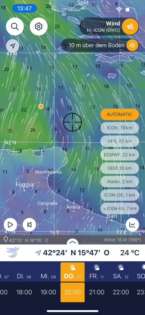Da wäre mal das Wetter, bzw. der Wind, der uns die Richtung vorgibt. Im ersten Bild sieht man die Wetter App“ Ventusky“, die ich für Prognosen verwende. Die weißen Striche zeigen die Richtung, in die er Wind bläst und die Farbe ist ein Maß für die Stärke (von blau – schwach bis rot – sehr stark). Für die Landratten: Man kann nicht gerade gegen den Wind segeln, denn beim Segeln liefert ja der Wind die Energie für den Vortrieb. Deshalb brauchen wir immer einen gewissen Winkel zum Wind und so ergeben sich meist unsere gefahrenen Kurse.