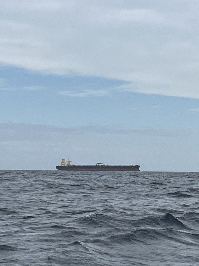 Im mittleren Bild sieht man einen Frachter, der uns begegnet ist. Dieses Schiff war ca. 300m lang und so einem riesen Gerät, weichen wir natürlich aus, wenn sich unsere Kurse kreuzen würden. Denn so ein Frachter braucht schon einige Kilometer Strecke, um eine Kurve zu fahren oder anzuhalten. Also : Safety First – Großräumig ausweichen.