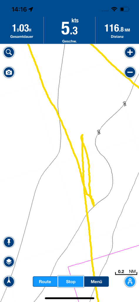 Tja und dann bleibt noch das letzte Bild. Das ist ein Bildschirmfoto von meiner Navigationsapp „Navionics“. So ein hübscher Kreis entsteht, ja ich gebe es ehrlich und offen zu, wenn ein Manöver, in diesem Fall eine Wende, schlichtweg in die Hose geht. Ich habe wohl wieder zu wenig kommuniziert (real hab ich mir was gedacht, dass aber nur so halb erklärt und mitgeteilt) und deshalb sind wir in der Wende verhungert, haben es also nicht geschafft die volle, halbe Drehung zu machen. Im Ergebnis steht das Boot im Wind und das Vorsegel (vorne am Schiff) ist verkehrt (schlecht ausgedrückt, ich erkläre die Wende später) und dann macht man halt ein Kreiserl, damit die Segel wieder richtig stehen und man wieder auf Kurs kommt.