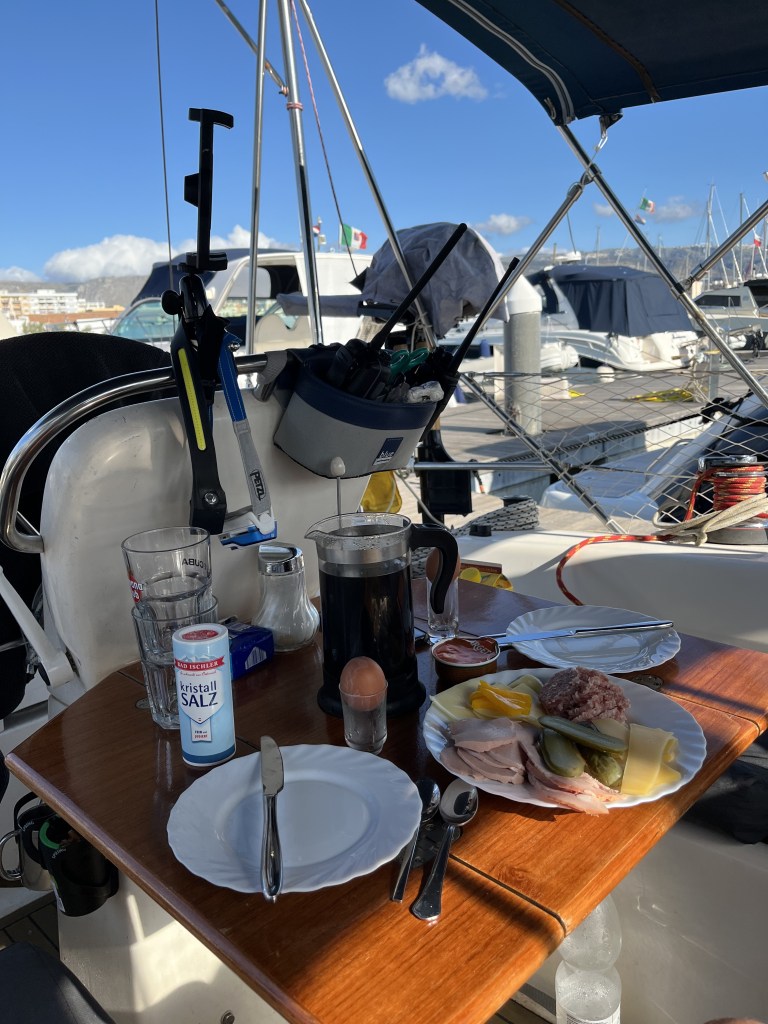 Ein wunderschöner Morgen erwartete uns heute in dieser traumhaften Marina! Frühstück auf der Terrasse unserer Inspiration mit Allem was dazugehört, auch mit weichgekochtem Ei. Ich hab schon ein Glück, dass die Manu das Zepter in der Pantry (Küche) schwingt, denn wäre ich der Smutje, gäbs nur Kaffee und Nutellabrot.