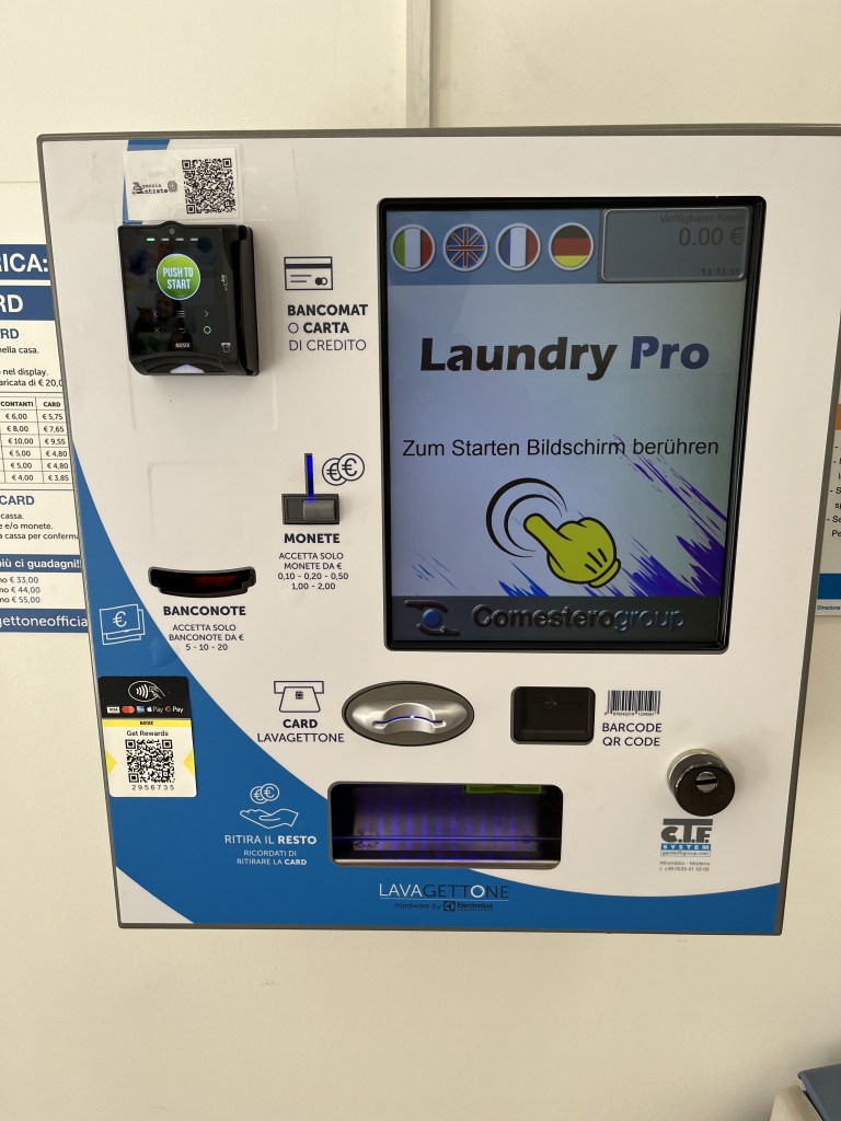 Da mein Italienisch ja unterirdisch ist, freut es mich natürlich wenn der Automat auch auf deutsch funktioniert. Ansonsten bin ich darauf angewiesen die Bilder zu deuten, was mir bei der folgenden Werbung im Waschsalon etwas „spanisch“ vorkommt, obwohl wir doch in Italien sind: