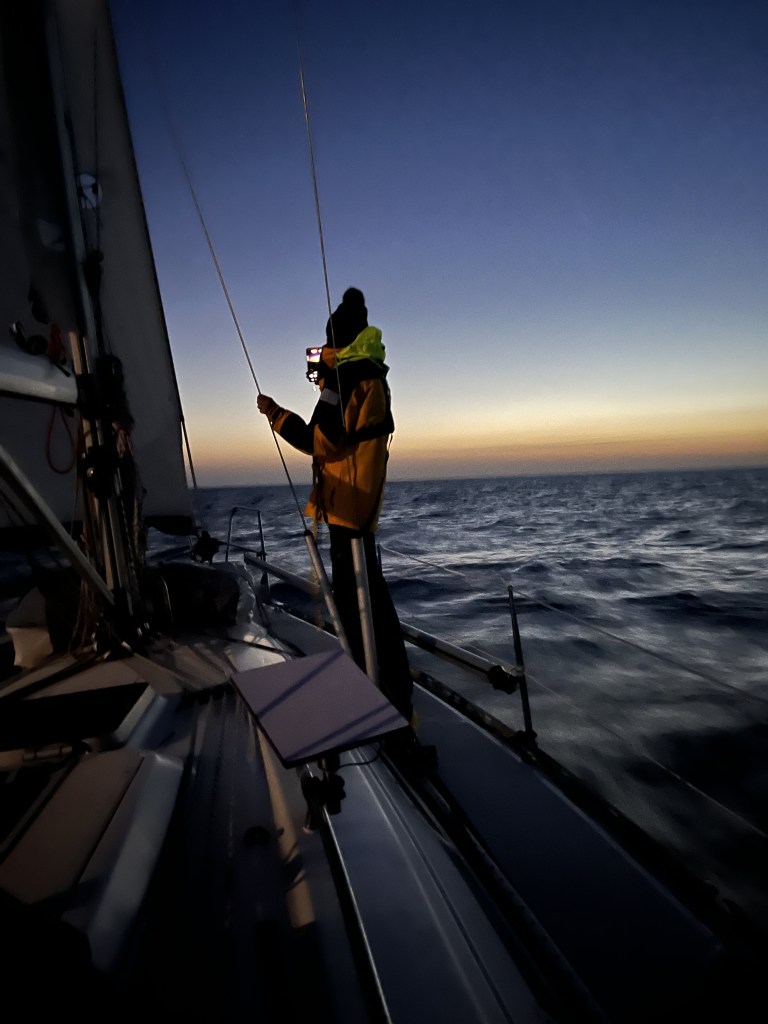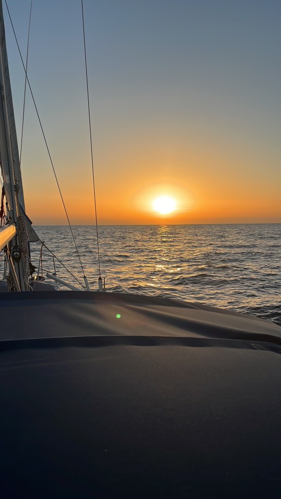 Nach dem Essen fahre ich noch in den Sonnenuntergang. Manu übernimmt um 19:00 ihre Wache und ich begebe mich zur Ruhe. Um Mitternacht läutet mein Wecker, meine Schicht fängt um 01:00 Uhr an. Ausgestattet mit Rettungsweste und Lifeline geht es zur Ablöse ins Cockpit. Immer wenn wir Nachts alleine im Cockpit der Wache nachgehen, sind wir mit unseren Lifelines. (so ähnlich wie die Gurte, die man auf Klettersteigen verwendet) in die Strecktaue (das sind Bänder an Deck die fix mit dem Schiff verbunden sind) eingehakt, um nicht bei Seegang über Bord zu fallen.