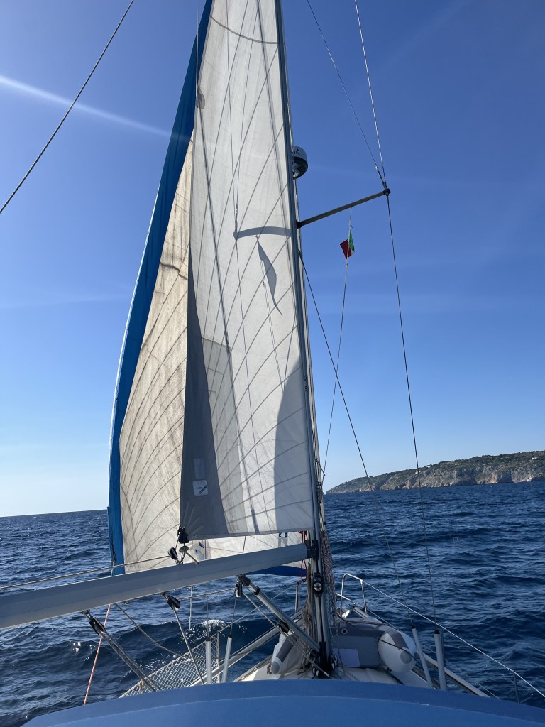 Als wir in den Golf von Taranto, das ist die große Bucht im Süden von Italien, einfahren, haben wir perfekten Wind. Wir können die Segel hissen, wie ihr am vierten Foto oben seht. Ausser bei schwachen Wind ist unser Großsegel (das hinter dem Mast) immer ein wenig eingerefft, da sonst die Schräglage des Bootes unangenehm groß wird. Das sieht zwar für Andere toll aus, wenn man mit extremer Schräglage unter vollen Segeln durchs Wasser schneidet, aber aero- und hydrodynamisch ist das wirklich nicht das Gelbe vom Ei. Es kann auch gefährlich werden, denn das Ruder (das ist dass Steuerblatt unter dem Boot, mit dem wir die Fahrtrichtung beeinflussen) liegt dann nicht mehr senkrecht im Wasser sondern schräg. Dadurch hat es weniger Wirkung und durch diese Schräglage wird ein Strömungsabriss am Ruder wahrscheinlicher, bei dem das Boot kurzzeitig ausser Kontrolle ist. Man nennt das dann auch einen Sonnenschuss.