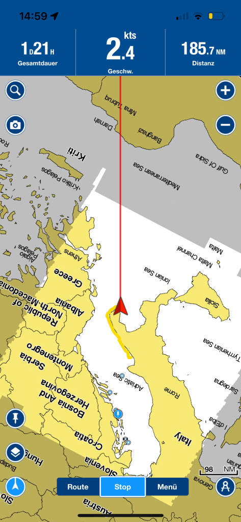 Als wir den Golf von Taranto erreichen, haben wir schon 180 nM zurückgelegt. „nM“ steht für nautische Meilen, das ist eine Strecke, die in der Seefahrt eben so angegeben wird. 1 nM entspricht 1,852 Km. Die Geschwindigkeit wird auf einem Schiff nicht in Km/h gerechnet sondern in Knoten (kt), wobei sich an den Berechnungsformeln (s=v*t) nichts ändert. 1 Knoten bedeutet also, dass wir in einer Stunde eine Strecke von einer Seemeile (1,85 Km ) zurücklegen. Der Zusatz „See-“ oder „nautische“ Meile soll der Unterscheidung zur Landmeile dienen, die mit dem Faktor 1,5 gerechnet wird.