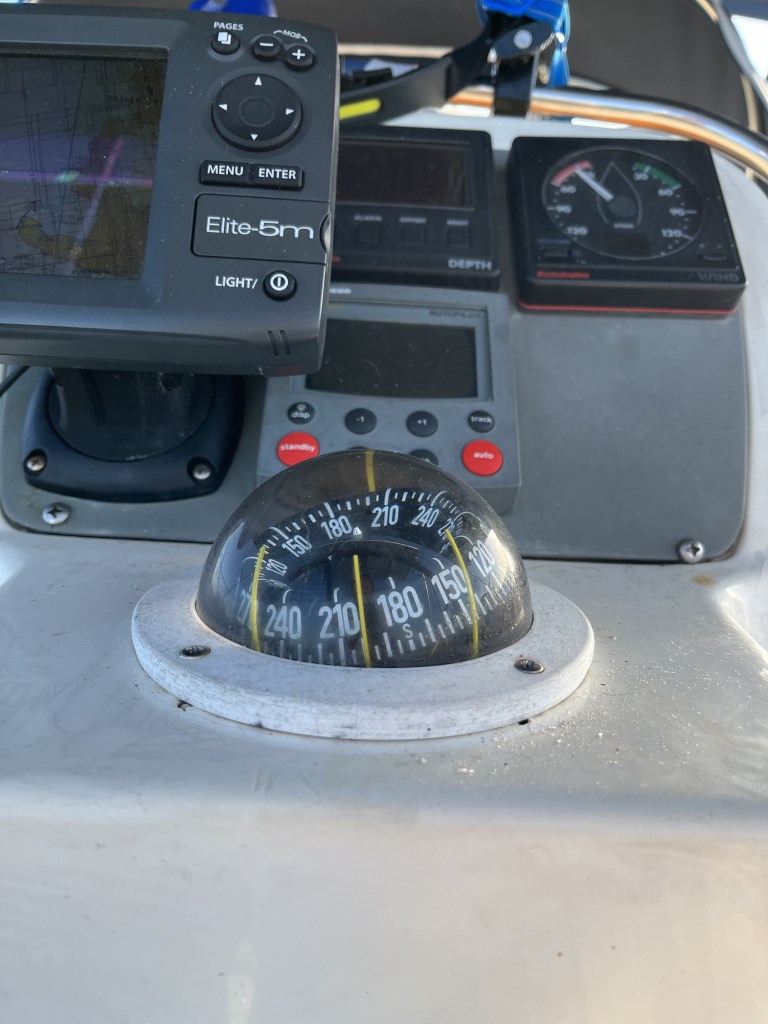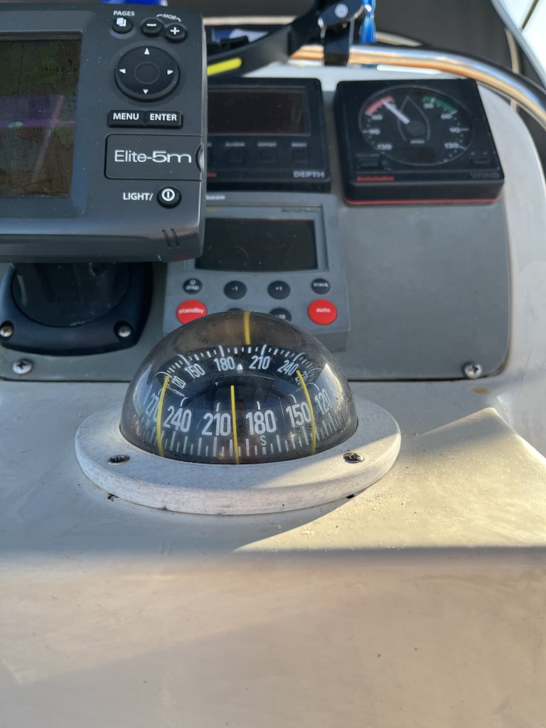 Links im Bild ist unser Kurs sichtbar, rechts im Bild der Kompass, allerdings nur symbolisch, das Bild habe ich tagsüber gemacht. Bei Tag ist es einfach, den Kurs zu halten, denn meist gibt es am Horizont irgendwas, an dem man sich orientieren kann. Nachts ist vor einem nur die Schwärze. Daher sieht man ständig auf den beleuchteten Kompass um auf Kurs zu bleiben. Wenn das Boot aus dem Kurs läuft, stellt sich die Frage, in welche Richtung man das Steuer jetzt drehen muss, und das kann durchaus verwirrend sein und führt auch manchmal zu Steuerfehlern. Denn der Kompass dreht sich nicht, sondern daß Schiff dreht sich um den Kompass. Der Kompass zeigt immer nach Norden, nur am Schiff sieht es aus als würde sich der Kompass drehen.