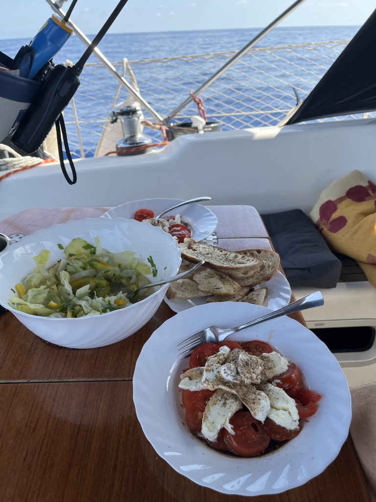 Während der Überquerung des Golf von Taranto neigt sich der Tag schön langsam seinem Ende zu. Bevor die Sonne am Horizont in den Dunst eintaucht, gibt es nochmal eine leckere Bordjause, um Energie für die Nacht zu tanken. Die Nacht verspricht anstrengend zu werden, denn der Wind ist mittlerweile verschwunden und die Wetterdaten zeigen auch keine Besserung. Das bedeutet, die Windsteuerung kann nicht arbeiten. Selbst steuern ist angesagt.
