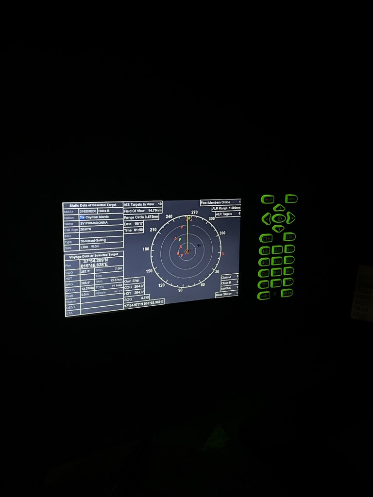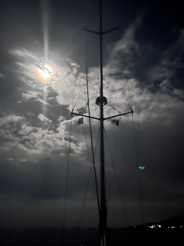 Am Steuer stehend fahre ich nun schon seit einigen Stunden im vom Mondlicht erhellten Meer dahin. Lichter am Horizont weisen auf regen Schiffsverkehr hin. Die Straße von Messina zwischen Sizilien und Italien ist nicht mehr weit weg, ebenfalls wieder eine stark befahrene Route für Schiffe von und nach Genua.