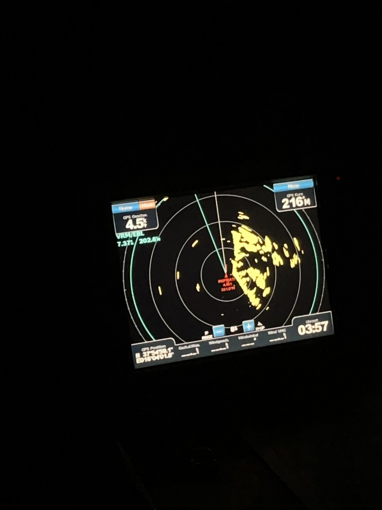 Ein schneller Blick auf das Radar läßt mich erkennen, dass es nicht der Tanker sein kein, denn der ist genau dort, wo er vor 2 Minuten auch noch war, mit einem Abstand von 3 nM. Was auch immer es ist, es kommt schnell auf mich zu und ich ändere sofort meine Kurs, als das Licht hin und her zu schwenken beginnt. Das ist gar kein Dampferlicht, sondern ein Suchscheinwerfer!!! Aber wer? und warum kommt das Objekt so schnell auf uns zu ? Einige Momente später erkenne ich schon den Rumpf des andern Bootes und sehe dort im vorderen Drittel einen dicken schrägen Streifen und dann daneben noch einen dünneren. Jetzt ist mir alles klar und ich drossle unser Tempo und grüße freundlich. Es ist ein Boot der Guarda civil/Guarda Finanza/Küstenwache. Sofort nach meiner Begrüßung machen sie eine 180° Drehung und brausen wieder davon.