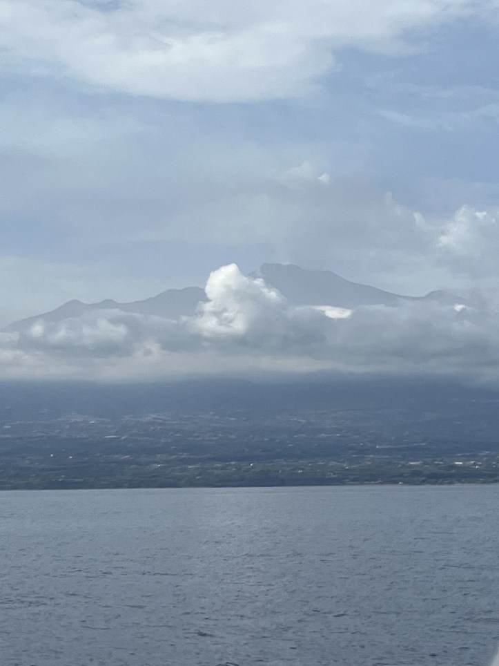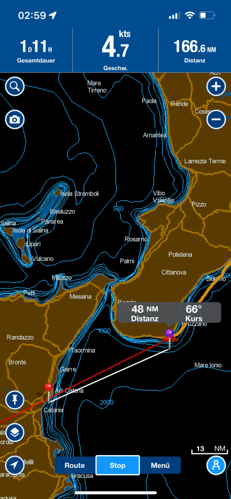 Was genau das jetzt war kann ich nicht sagen. Ich vermute, dass die Küstenwache den eigenartigen Verlauf unseres Fahrweges mitverfolgt hat und einfach nachsehen wollte, ob bei uns alles in Ordnung ist. Jedenfalls hab sie mir einen gehörigen Schrecken eingejagt. Warum sie sich nicht über Funk gemeldet haben ? Haben sie wahrscheinlich, jedoch hatte ich das Hauptfunkgerät ausgeschaltet und nur das Handfunkgerät im Cockpit an. Es stellte sich heraus , dass bei diesem der Akku leer war und wir somit nicht erreichbar. Der Rest der Nacht verlief ruhig und in den Morgenstunden, nachdem Manuele schon mit frisch gebrühtem Kaffee zu mir in Cockpit gekommen ist, war er dann endlich zu sehen, der Ätna. Sizilien wir kommen!