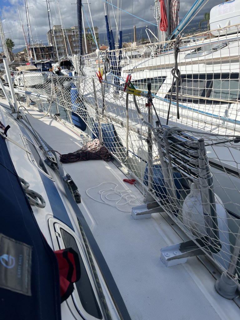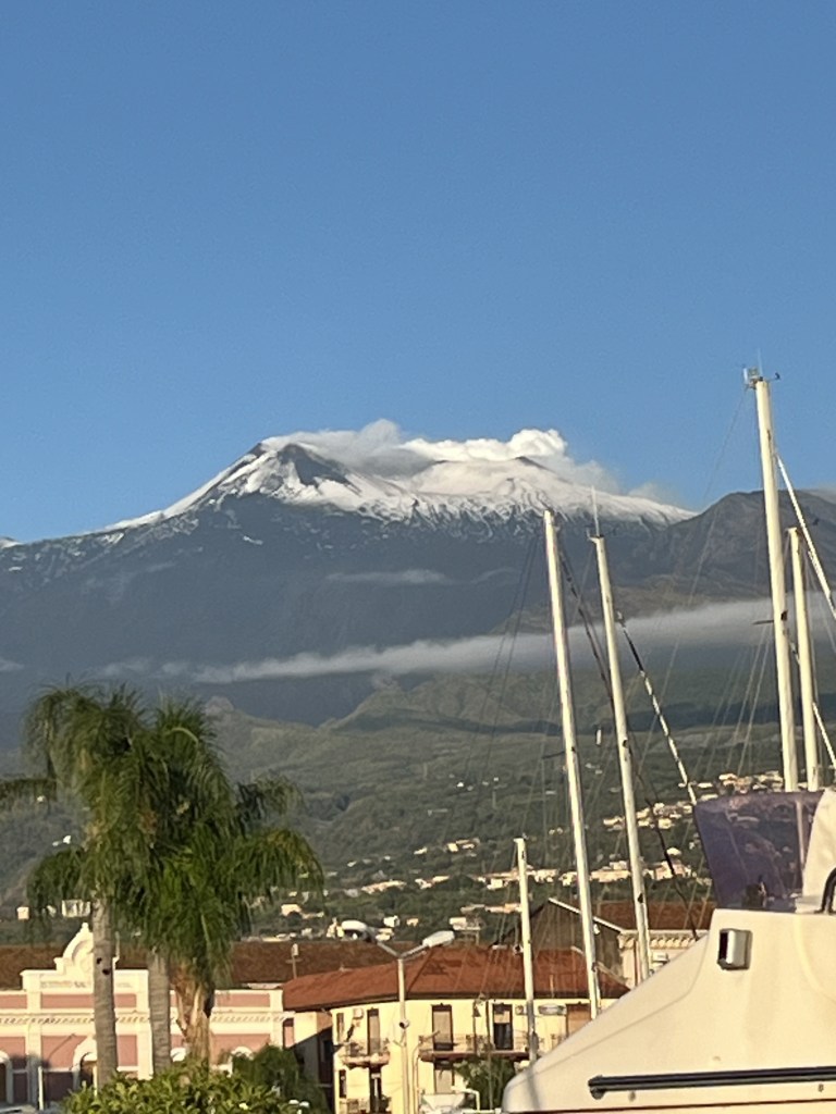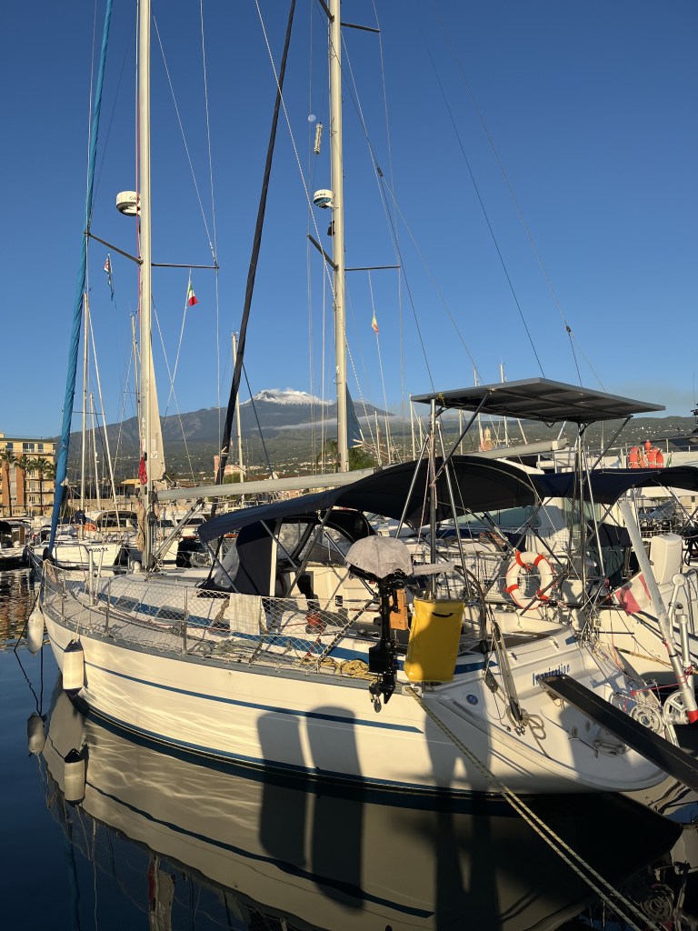 Am nächsten Tag erwartet uns ein perfekter Morgen. Der Ätna präsentiert sich in voller Pracht. So soll es sein! Frühstück bei dieser tollen Kulisse, geküßt von der sanften Wärme der Morgensonne. Ursprünglich wollten wir heute schon aufbrechen. Als ich am Freitag im Marina Office war und mich über die Abreiseformalitäten erkunden wollte, fragte mich die nette Dame, ob ich den Wetterbericht studiert hätte. Sie meinte weiter, dass alle anderen Fahrtensegler bis Dienstag oder Mittwoch verlängert hätten, da es eine Wetterwarnung für diese Region gäbe.