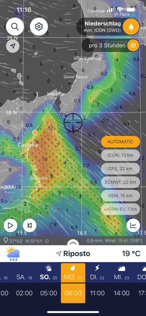 Laut meiner Wetterapp „Ventusky“ wird das Wetter nochmal schlechter, bevor es dann ab Dienstag Mittag für die nächsten Tage passen wird. Unser Plan ist es, am Dienstag Richtung Norden aufzubrechen. Ziel ist der Stromboli. Dazwischen ist die Straße von Messina, eine Meerenge zwischen Sizilien und dem Festland Italiens. Dort müssen Wind und Strömung passen, damit wir zügig durchkommen. Wie sich gezeigt hat, war die Vorhersage sehr akkurat. Denn in der Nacht kehrten die Gewitter zurück. So auch der Regen, der sich kurzzeitig zum Starkregen empor geschwungen hat. Nur der Wind änderte sich kaum.