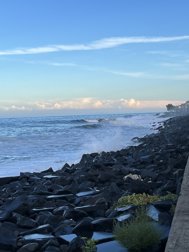 Nachdem wir die Waren an Bord verstaut haben, nutzen wir das Wetter noch und flanieren der Uferpromenade entlang. Wellen brechen unter großem Getöse am Ufer und hüllen die Promenade stellenweise in feinen Nebel, der in der Abendsonne kristallgleich schimmert. Unser Weg führt uns weg vom Ufer zu einem Park in mitten eines Kreisverkehrs. Die Bäume dort müssen hunderte Vögel beherbergen, denn aus den Kronen der buschigen Riesen piepst und zwitschert es gewaltig.