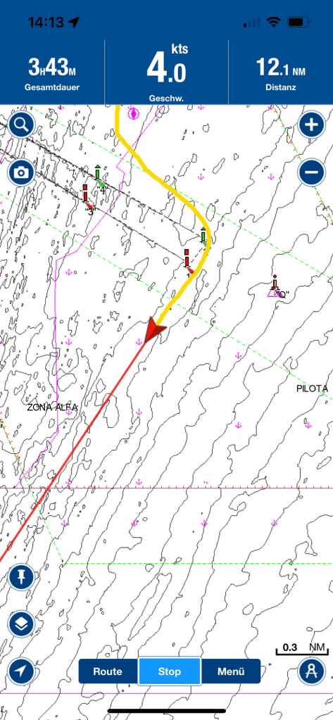Am ersten Bild seht ihr unsere windbedingte Route. Ein etliches Stück weiter konnten wir noch unter Segeln fahren, bevor kurz vor Einbruch der Dunkelheit, am dritten Tag, der Wind zu einem lauen Lüftchen mutierte. Das verlangte uns den Start der Maschine und die weitere Fahrt unter Motor ab. Jetzt hieß es wieder aktiv Steuern, nichts war es mit einer chilligen Nacht. Doch auch diese nahm irgendwann ein Ende.