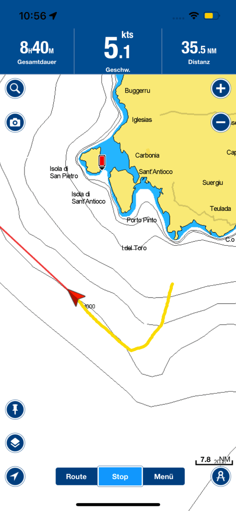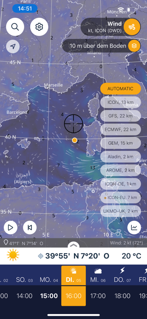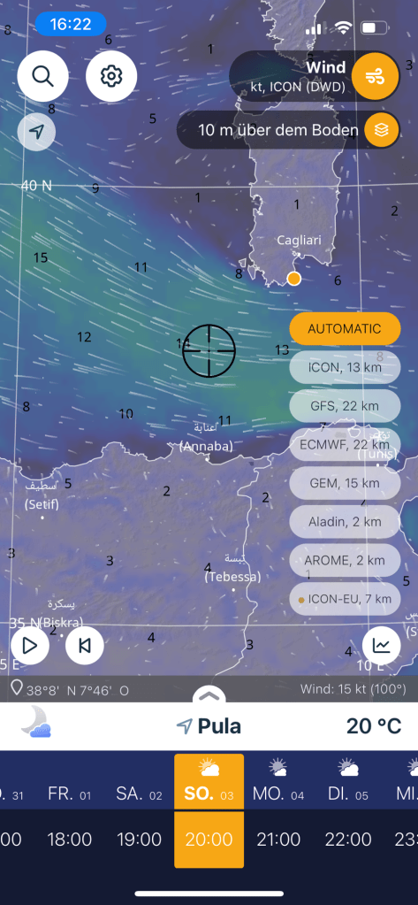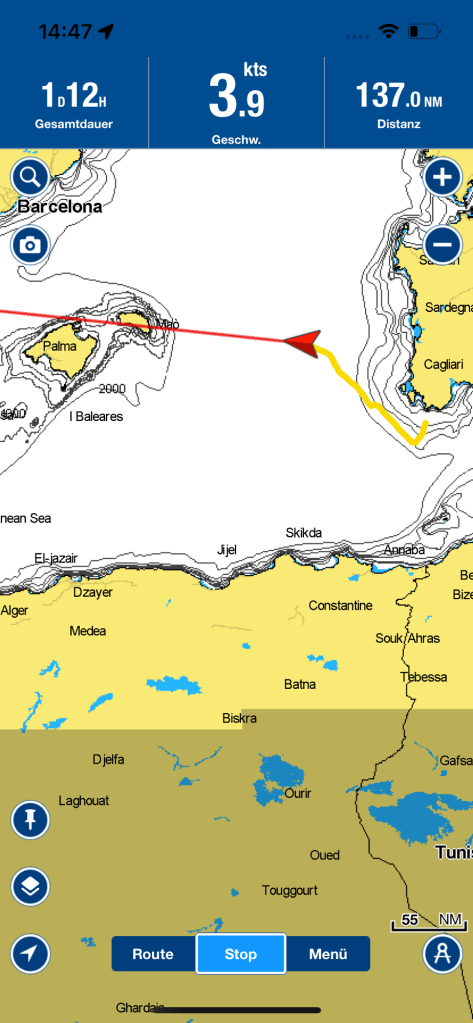 Unser weiterer Kurs trug scheinbar etwas zur Verwunderung unserer Follower bei. Ein Kommentar auf Facebook fragte, ob wir denn jetzt nach Nordafrika wollten. Doch dieser lange Schlag nach Südwesten war dem Routing geschuldet. Einerseits wollten wir in den Südostwind kommen und andererseits mussten wir vorbauen, damit wir nicht in das Lee von Sardinien geraten würden. „Lee“ ist die windabgewandte Seite der Insel und dort bildet sich ein Windschatten mit teils Winden in die Gegenrichtung, sogenannten „Leewirbel“ aus.