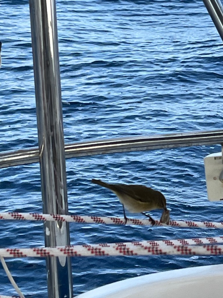 Die Vögel haben offensichtlich an uns einen Narren gefressen. Diesmal war einer in Funktion des Kammerjägers an Bord und hat sich sofort einen Nachtfalter geschnappt. Unglaublich, aber dieser in Relation große Falter ist im Schnabel des Vogels verschwunden.