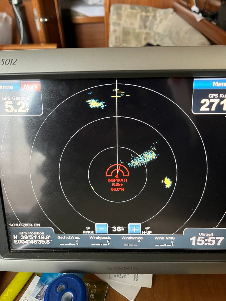 Der Wetterbericht, welchen ich am Morgen über Navtex (Ein spezieller Empfänger für Wetter und Navigationsmeldungen) empfangen habe, sprach von „isolated Thunderstorms“, also von vereinzelten Gewittern. Das war auch zu erwarten, da die umliegenden Cumulus Wolken schon sehr bald sehr hoch reichten. Der Meteorologie spricht von einer „labilen Schichtung“. So tauchten zwischen uns und Menorca Gewitterzellen auf, welche am Radar (rechtes Bild) sehr gut zu erkennen sind. Wir wichen ein wenig vom direkten Kurs nach Süden ab und konnten alle Zellen erfolgreich umfahren ohne nasse Füße oder Köpfe zu bekommen.