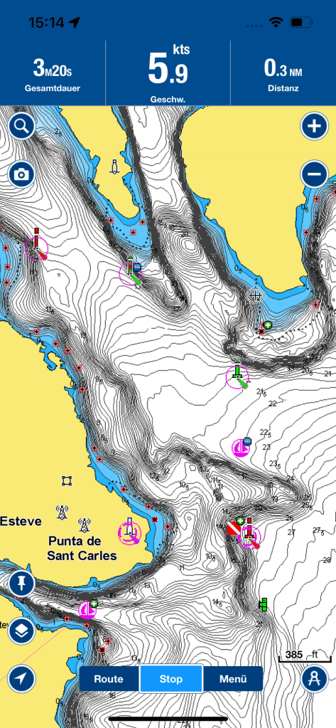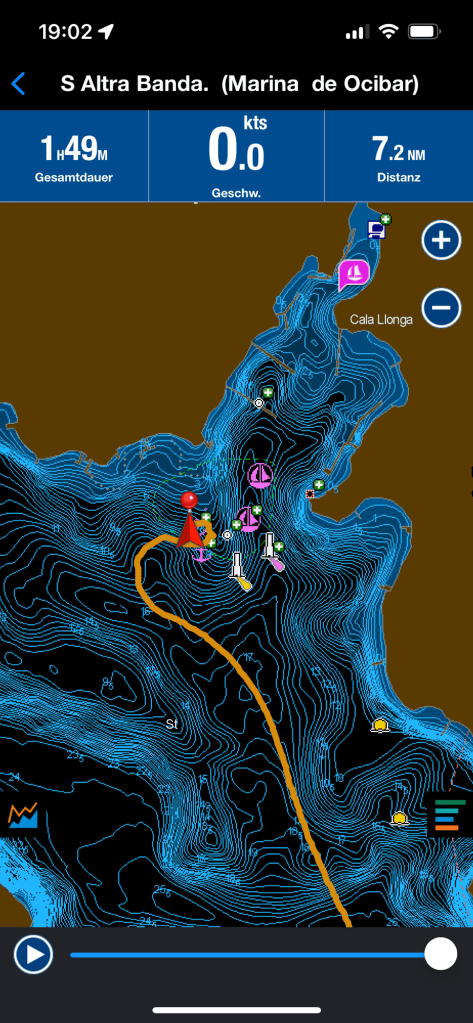Leider zeichnete sich immer mehr ab, dass wir die Einfahrt in die Bucht von Mahon nicht mehr bei Tageslicht erreichen würden. Der Eine oder Andere mag jetzt sagen : “ Wo ist das Problem, ihr habt doch GPS“. Tatsächlich basiert ein Großteil unserer Navigation auf GPS. Doch als verantwortungsvoller Skipper denkt man manchmal auch in sogenannten „Worst Case“ Szenarien. Dieser Worst Case wäre ein Ausfall der Elektronik bei Dunkelheit in der Mitte der engen Einfahrt. Daher habe ich mich mit Karte und „Navionics“ (Navi APP für Seefahrer) am Handy an den Kartentisch zurück gezogen, um eine Skizze unserer Route, sowie eine Liste der anzusteuernden Leuchtfeuer mit Kennung und zu fahrendem Kurs angefertigt. Die zu erwartenden Tiefen habe ich ebenso einbezogen, denn auch der Tiefenmesser kann der Navigation dienen. Nachdem diese Routenplanung für Ein-und Ausfahrt fertig war, begab ich mich zu Manu ins Cockpit die inzwischen die Inspiration auf eine Meile an die Einfahrt in die Bucht herangeführt hat.
