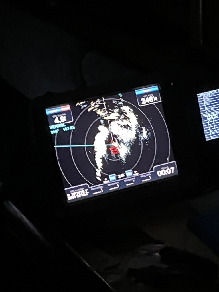 Als mittlerweile kundige Leser fragt ihr euch natürlich jetzt, warum das ein Problem sei, denn wir haben ja noch das Radar. Prinzipiell habt ihr Recht und in einer anderen Situation hätte uns der Radarkontakt geholfen, auch wenn das AIS des Gegenübers nicht funktioniert hätte. Doch haben die Gewitter unser Radarbild vollends ausgefüllt und somit war es für uns nicht möglich, unter den ganzen Radarechos herauszufinden, was jetzt der französische Segler ist und was nicht.