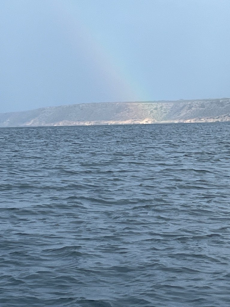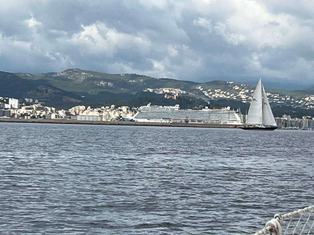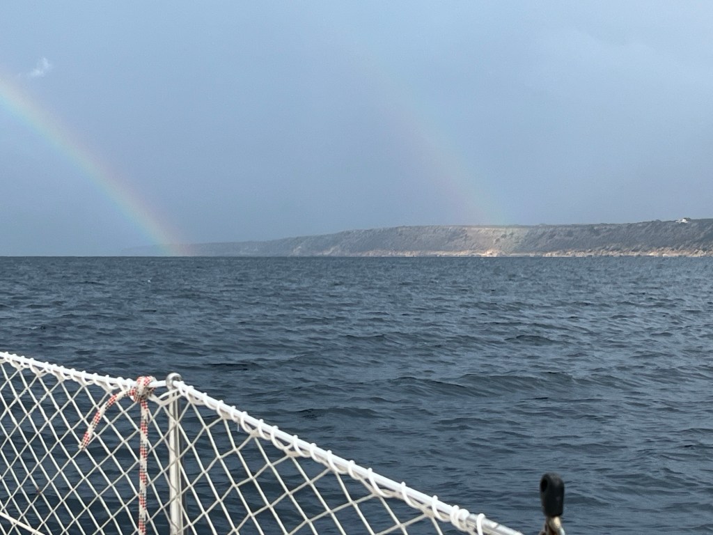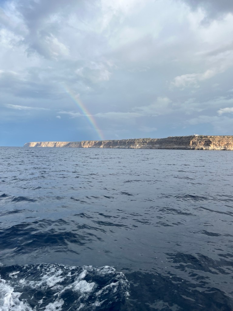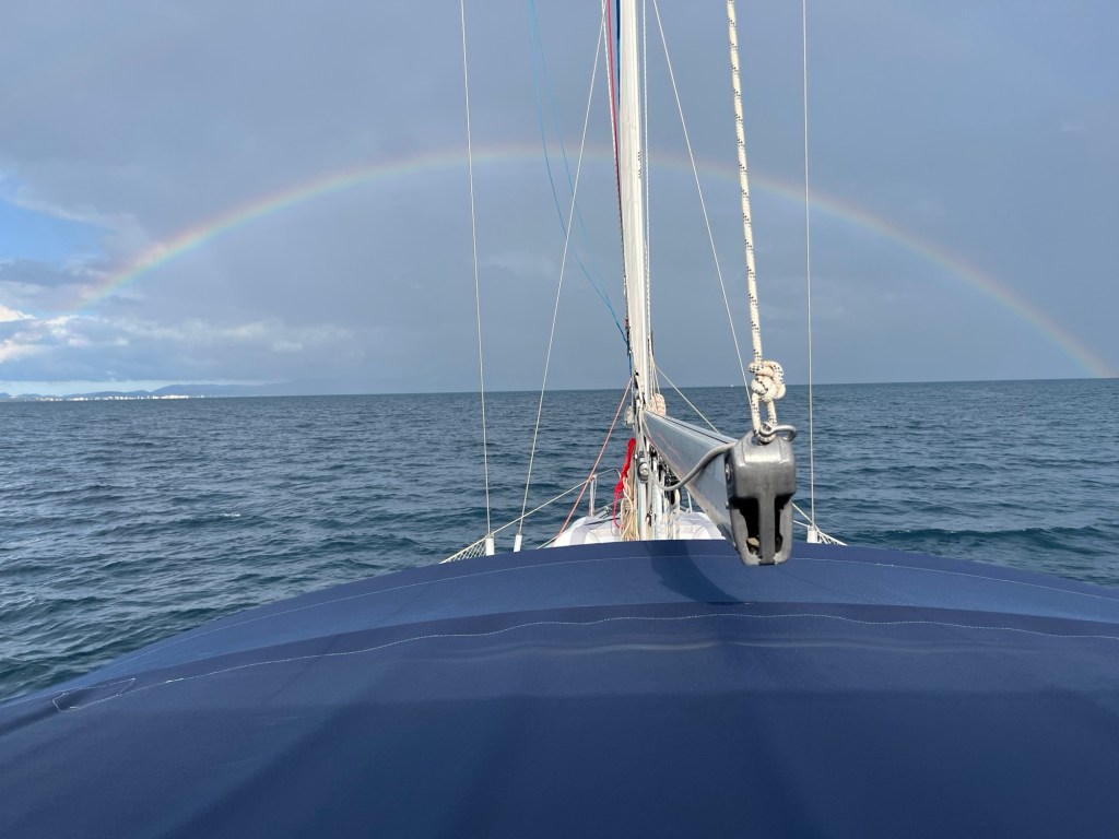 Als ich von meiner Freiwache zurückkehre, haben wir ein gutes Stück an Strecke gemacht. Wir sind noch ca. 4 Stunden von Palma de Mallorca entfernt. Mittlerweile wurde meine Liegeplatzanfrage bestätigt, wir werden die Zeit in Palma im „Real Club Nautico Palma“ verbringen. Palma heißt uns freundlich willkommen, denn ein Regenbogen löst den nächsten ab. Es scheint fast, als würde sich die Insel über unseren Besuch freuen. Der Höhepunkt ist ein voller Bogen, auf den wir zufahren. Wir haben zwar guten Wind, aber leider direkt von vorne. Wir müßten dagegen aufkreuzen. Das macht zwar Spaß und ist voller Action, aber nicht sehr effektiv, besonders, wenn man nicht viel geschlafen hat und so fahren wir ein wenig zähneknirschend mit Motor direkt auf Palma zu.