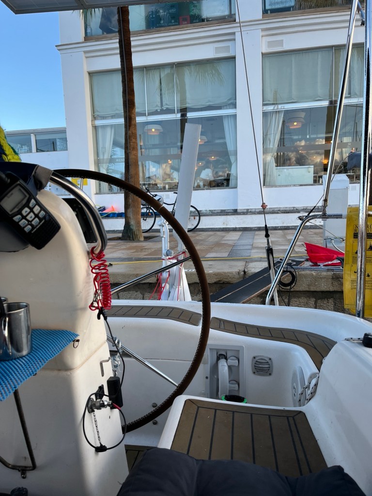 Auf der Überfahrt hierher hat sich Sonderbares zugetragen. Ihr müsst wissen, dass wir, wenn wir auf See sind 2 Fender an der Innenseite der hinteren Cockpitbegrenzung anbringen. Dadurch ergibt sich ein komfortabler Sitz an dem sich auch längere Nachtwachen gut verbringen lassen. Dieser „Sitz“ befindet sich Backbords, also links, weil rechts die Leinen der Windsteuerung verlegt sind.