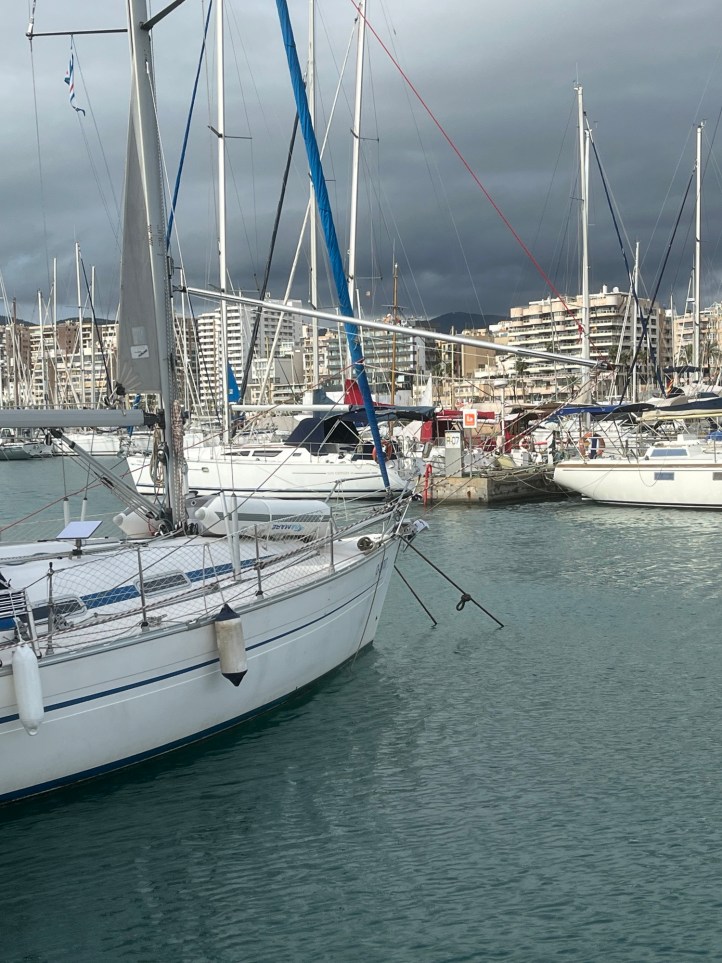 Während Manuela gestern Vormittag auf die Jagd nach Vorräten ging, machte ich mich daran das Setting und die Prozedur zur Verwendung unseres Spinakerbaumes zu optimieren und zu testen. Der „Spibaum“ ist eine ca. 4 Meter lange Stange, mit der in unserem Fall die Genua ausgestreckt wird. Das braucht man dann, wenn man vor dem Wind fährt. Ohne die Stange würde dass Segel immer wieder einfallen, sobald man minimal vom Kurs abweicht. Diese Kursabweichungen sind bei Wellengang unvermeidlich, deshalb wird eben dieses Segel gestützt, man sagt „ausgebaumt“. Dazu sind mehrere Leinen nötig, was organisiert gehört. Auch sollte die Prozedur des Setzens und Bergens durchgeübt werden, denn im Hafen, wo sich das Boot nicht bewegt ist es eine Sache, das Setting anzubringen, auf See bei Wind und Wellen eine ganz Andere. Als Manu zurückkam, war ich mit dem Setzen fertig, wir bauten alles wieder zurück und machten die Inspiration klar zum Ablegen.