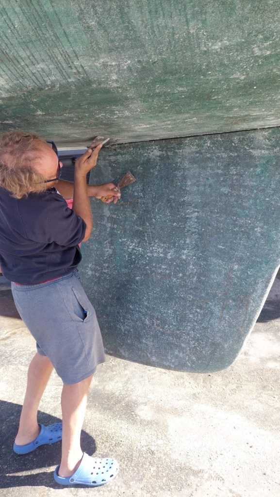 Die Inspiration wurde in der Folge aus dem Wasser gehoben und mittels Hochdruck gewaschen, sodass der Großteil des Bewuchses, der sich mittlerweile am Rumpf festgesetzt hatte, abging. Anschließend bewaffnete ich mich mit einer Spachtel und entfernte die Reste von kleinen Muscheln (sogenannte Seepocken) von Rumpf, Kiel und Ruderblatt. Dadurch vermindert sich natürlich der Wasserwiderstand, was das Boot schneller macht.