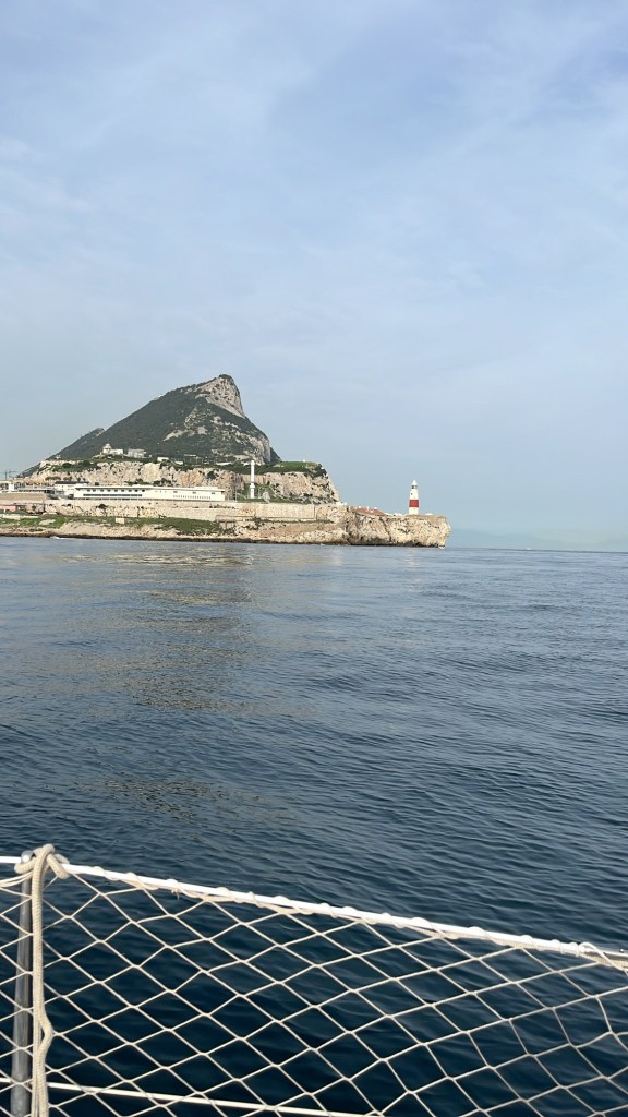 Einige Zeit später hoben sich Umrisse aus dem golden Schein hervor, Afrika am Horizont. Die Inspiration drehte ihren Bug gen Westen. Mit dem Fernglas sah ich mir den Felsen von Gibraltar an, ich konnte mich kaum satt sehen. Die Hochhäuser an der Nordseite, der gewaltige Osthang, angelegt um Wasser zu sammeln, die Kanonen auf der Südspitze, Zeugen der kriegerischen Vergangenheit. Viel, viel mehr gab es noch zu sehen, doch ein Objekt fesselte meine gesamte Aufmerksamkeit, zumal es auch schon ohne Fernglas gut erkennbar war. „Point Europe“.