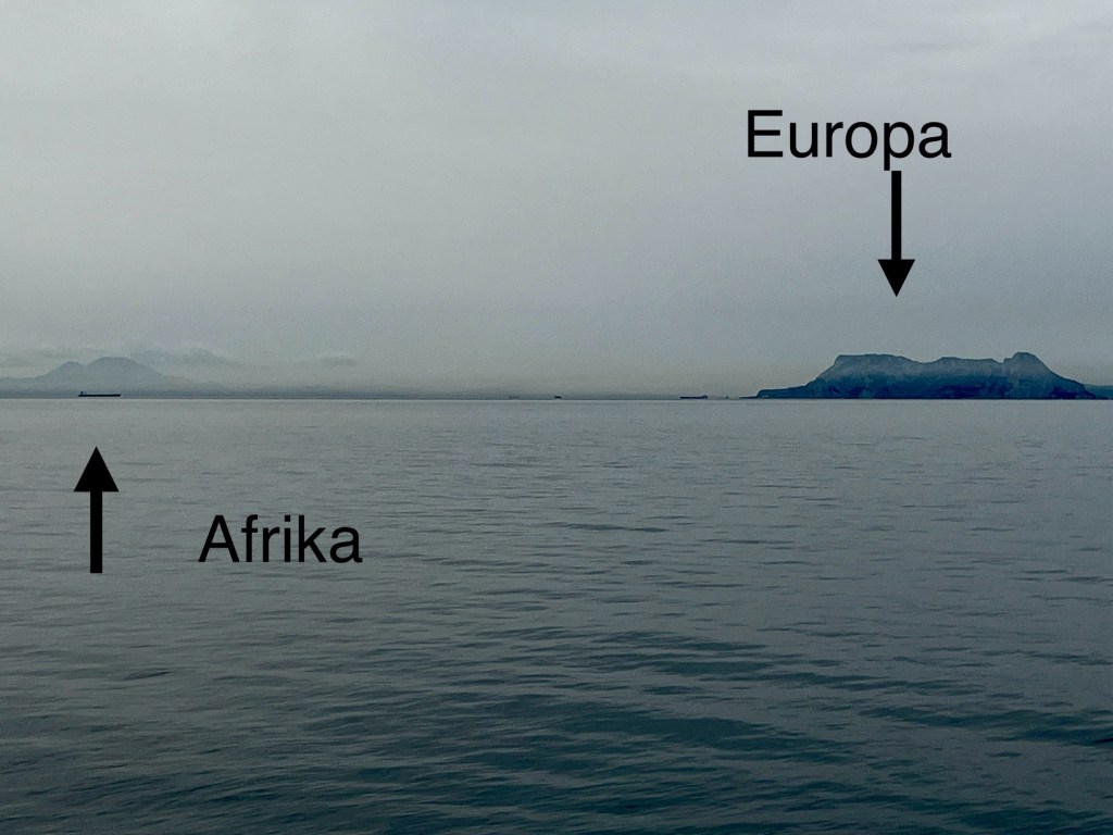 Point Europe! Mich überkam eine tiefe Freude, die mich fast zu Tränen rührte, denn wir hatten unser erstes Etappenziel erreicht. Manuela und ich sind unseren Träumen gefolgt und haben mit unserer Inspiration das Mittelmeer durchquert. Wenige Minuten bevor wir diesen Schicksalspunkt erreichten, stellte ich eine WhattsApp Videoverbindung zu meinen Eltern her. Gemeinsam mit uns erlebten sie hautnah die Einfahrt in die Straße von Gibraltar. Die Bucht von Gibraltar war mit einer Vielzahl auf Reede liegenden Tankern, Frachtern und Containerschiffen gespickt. Manu steuerte die Inspiration routiniert zwischen diesen sanften Riesen durch, ganz der Skipper, der sie auf den letzten 1500 Seemeilen geworden war.