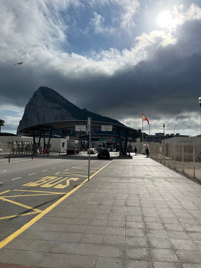 Der nächste Tag stand ganz im Zeichen der Stadt Gibraltar. Wir wollten den Affenfelsen besichtigen, durch die Altstadt von Gibraltar schlendern und einige Besorgungen machen. Entsprechend enttäuscht waren wir, als vormittags der Fels in eine dicke Wolke gehüllt war. Da uns nichts trieb, blieben wir bis Mittag auf der Inspiration. Nach einem leckeren Süppchen machten wir uns „per Pedes“ auf den Weg. Denn in de Rezeption sagte man uns, es sei nur eine viertel Stunde Fußmarsch nach Gibraltar. So war es dann auch und dieser Fußmarsch war wohl einer der spektakulärsten, die wir jemals gemacht hatten, denn in Gibraltar quert man die Startbahn des örtlichen Flughafens. Was für ein Erlebnis. Nach einer kurzen Passkontrolle waren wir in „Very British“ Gibraltar.