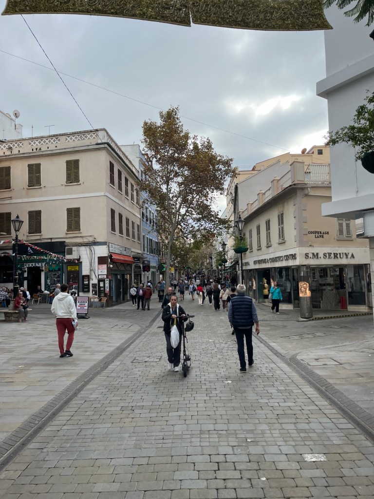 Da der andere Händler für uns zu Fuß völlig außer Reichweite war, gaben wir unser Vorhaben auf. Wir entschieden uns, die Altstadt auf dem Weg zur Seilbahn zu durchstreifen. Es war erstaunlich, wieviel zu dieser Jahreszeit hier los war. Die Straße war voll von Geschäften für Luxusartikel, Tabakwaren, Weine und stärkere Sachen. Cafe um Cafe säumte die Straßen und Restaurants für jeden Geschmack vervollständigten das Bild. Wie auch schon zuvor Marbella, hatte Gibraltar schon das Weihnachtskleid angelegt, wie an den Häusern, den Weihnachtsbäumen auf den Plätzen und den Dekorationen der Geschäfte unschwer erkennbar war.