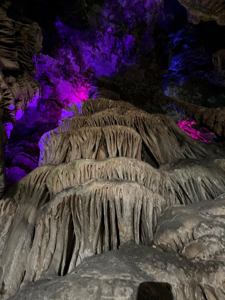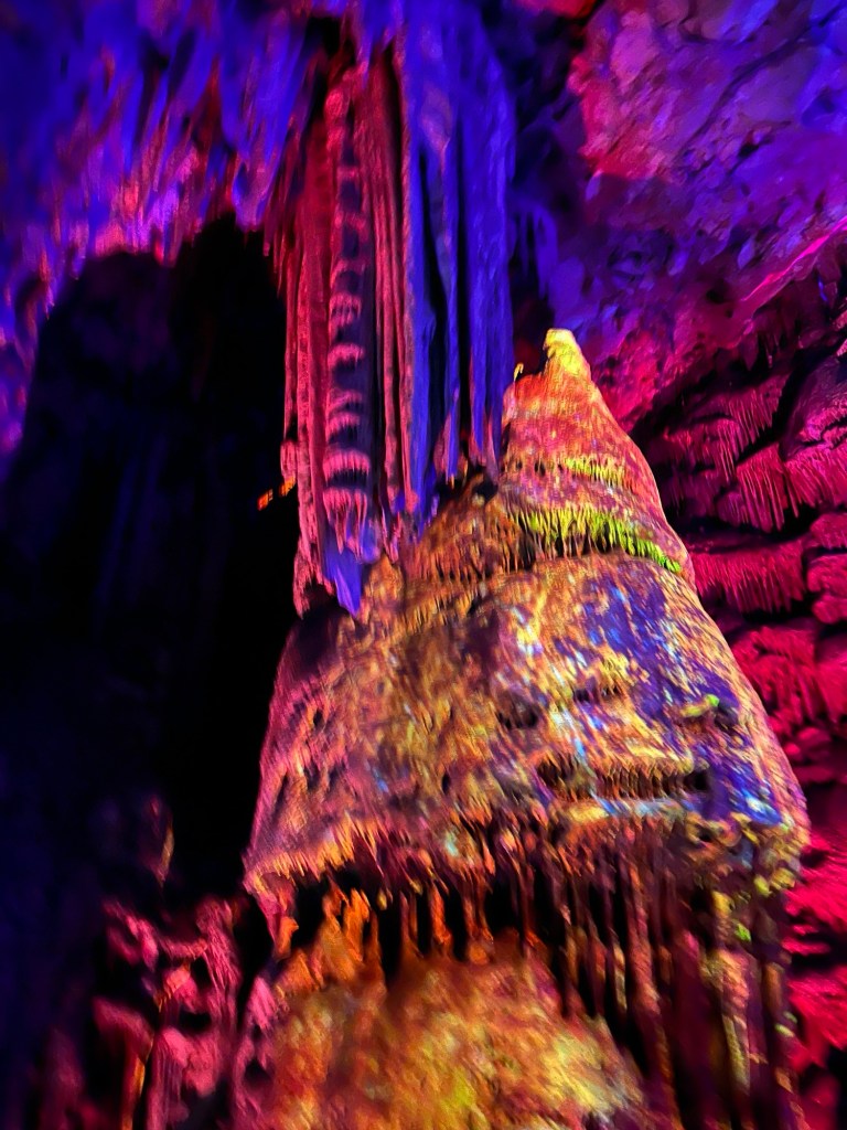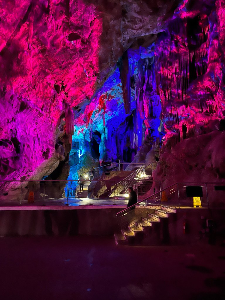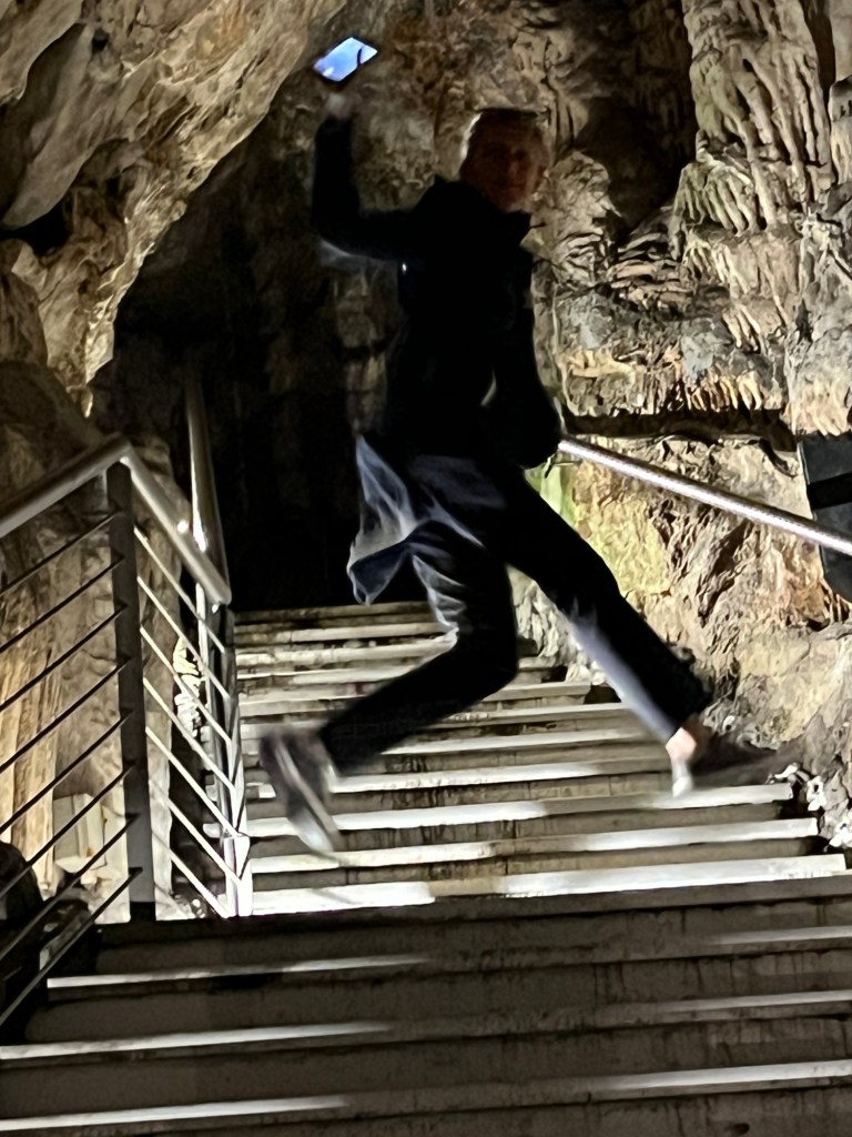 So brausten wir den Berg auf engen Straßen hoch. Die erste Station war eine der vielen Höhlen des Felsen. Diese war eine Tropfsteinhöhle mit Stalagmiten und Stalaktiten enormen Ausmaßes. eine Lichtshow ließ diese wundersamen Gebilde noch eindrucksvoller wirken. Man hatte das Gefühl mit Gandalf dem Zauberer durch Minas Thirit zu streifen und fragte sich ob wohl hinter der nächsten Ecke der Drache Smaug lauern oder man auf König Laurins Gold stoßen würde. Es war wirklich sehr beeindruckend und den Besuch auf jeden Fall wert. Am Ausgang der Höhle befand sich ein kleines Restaurant, dass auch von den Affen frequentiert wurde. Das Glück war uns hold und die ersten Aufnahmen gelangen uns. Natürlich hat uns Adrian zuvor in die Do´s and Dont´s in Bezug auf diese Makaken eingewiesen. Vor allem : Direkten Augenkontakt vermeiden!