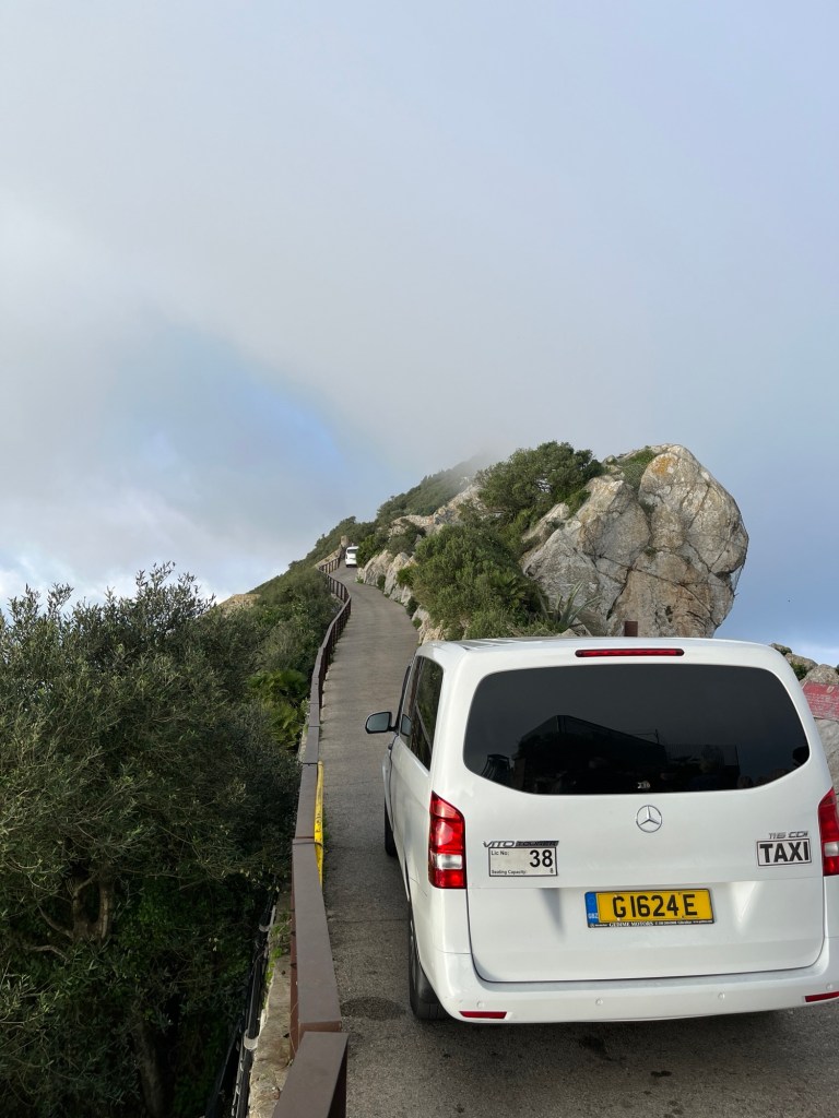 Mittlerweile waren wir schon die eine oder andere Landmeile gelaufen. Ich hatte mich für die „Ballerinas“ entschieden, was angesichts der harten, gepflasterten Straßen wohl nicht die schlaueste Entscheidung war. Die Seilbahn war zwar langsam zu sehen, doch die Füße sehnten sich nach einer Pause. Just in diesem Moment kam ein Mann auf uns zu und überschüttete uns mit einem Redeschwall. Nach und nach wurde klar, er wolle uns eine Tour auf den Affenfelsen anpreisen, doch nicht mit der Seilbahn, sondern mit seinem Taxi. Er hörte gar nicht mehr auf, die Besonderheiten seiner Tour und die Vorteile gegenüber einer Fahrt mit der Seilbahn zu betonen. Das hätte es nicht gebraucht, denn meine Füße hatten schon längst entschieden. Wir gesellten uns zu den andern 6 Reisenden, ein Pärchen aus Holland und 2 deutschen Pärchen in den komfortablen Mercedes Vito Bus. Los ging die wilde Fahrt.