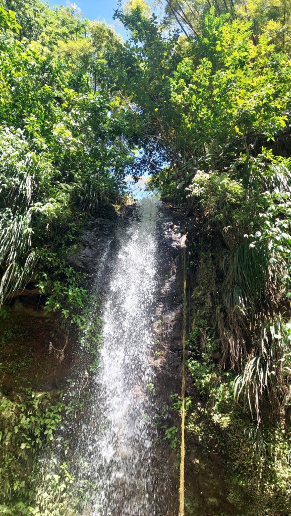 Ebenso wie bei den „Hot Pots“ mussten wir beim Wasserfall Eintritt bezahlen. Da sich meine Mitreisenden nicht durchringen konnten, ins vermeintlich kühle Nass zu springen, war es an mir, für ein episches Foto unter dem Wasserfall zu posieren. Es war dann auch nicht wirklich kalt, aber hart, zumindest das Wasser das aus ca. 15 Meter Höhe auf mich herunterstürzte fühlte sich so an. Trotzdem wiederholte ich das Ganze nach einer kurzen Pause, denn es hatte was Abenteuerliches und das ist es schließlich was wir sind: Abenteurer. Es blieb noch ein wenig Zeit die Umgebung zu betrachten. Wenn man sich die extra gebaute Anlage wegdachte, war es paradiesisch hier. Mitten im Dschungel gelegen umrankten exotische Pflanzen den Wasserfall. Es lud zum weiteren Erforschen ein, doch ist das, wie auch bei den „Hot Pots“ nicht erwünscht und bringt einem sofort einen Rüffel ein, wie wir bei anderen Touristen beobachten konnten. Einfach so in den Dschungel zu gehen ist wohl auch ein wenig riskant, da hier die „Martinique Lanzenotter“ heimisch ist, deren Biss als lebensbedrohlich eingestuft wird.