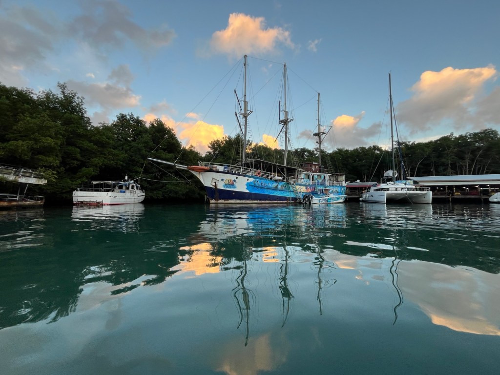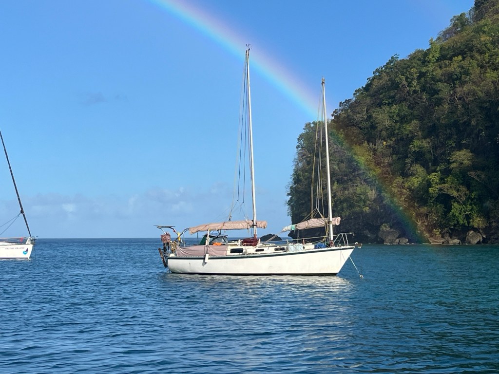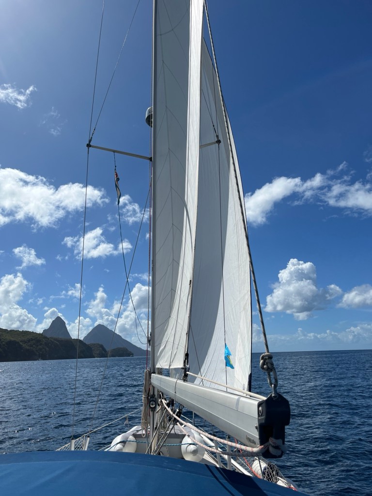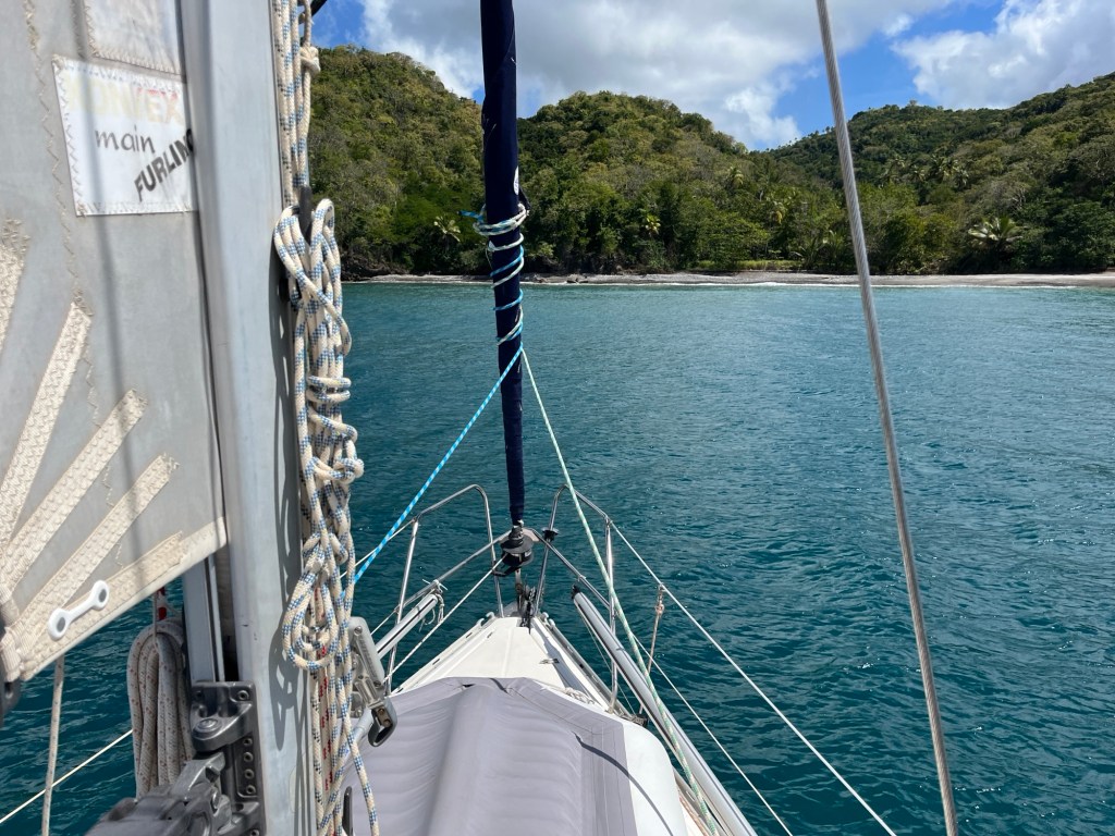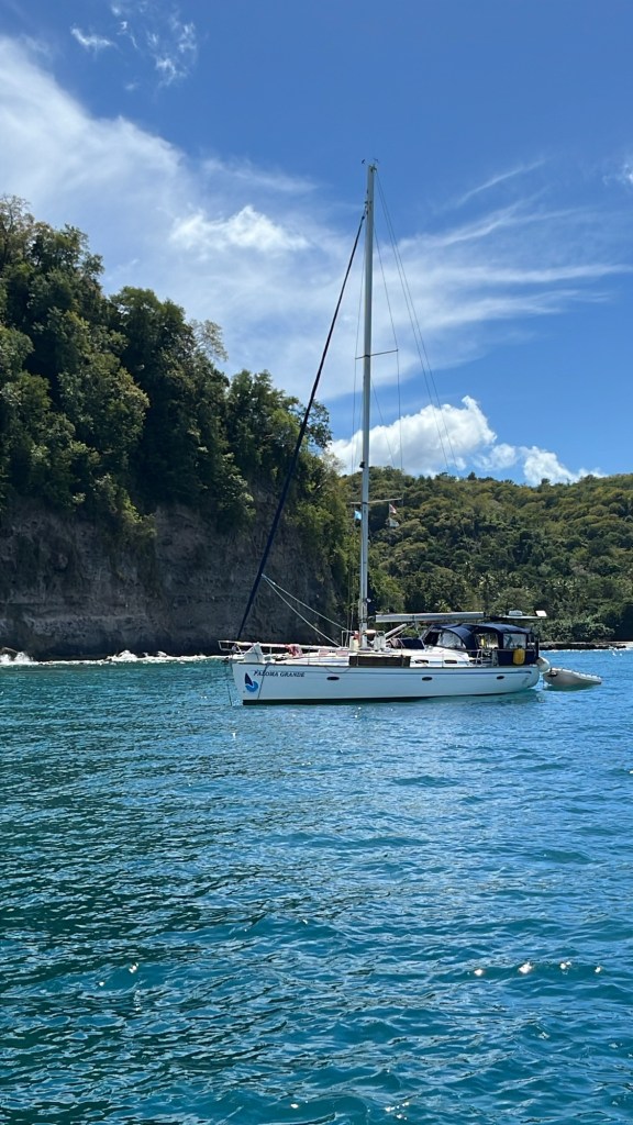 Wir verbrachten noch einige, schöne Tage in der Marigot Bay, bevor wir aufbrachen. Hier sollten sich nun unsere Wege für einge Tage von der Paloma Grande trennen, denn Claudi und Uli wollten noch nach Rodney Bay im Norden der Insel, während wir uns entschlossen hatten, gleich nach Martinique zu segeln. Das Ausklarieren gestaltete sich als überraschend unkompliziert. Obwohl die Port Authority nicht vor Ort war, versicherte mir die Polizistin im Immigration Büro, sie würde den Kollegen mit meinen Unterlagen versorgen und ich könne schon guten Gewissens abfahren. Was für eine angenehme Überraschung! So hoben wir unseren Anker und tuckerten unter Winken und Rufen an der Paloma Grande vorbei. Wir machten uns auf die vermeintlich nur sechs Stunden dauernde Überfahrt nach Martiniuqe, welche dann doch über zehn Stunden in Anspruch nahm und uns zwang, in der Nacht ins Ankerfeld zu fahren. Doch darüber lest ihr mehr im nächsten Beitrag!