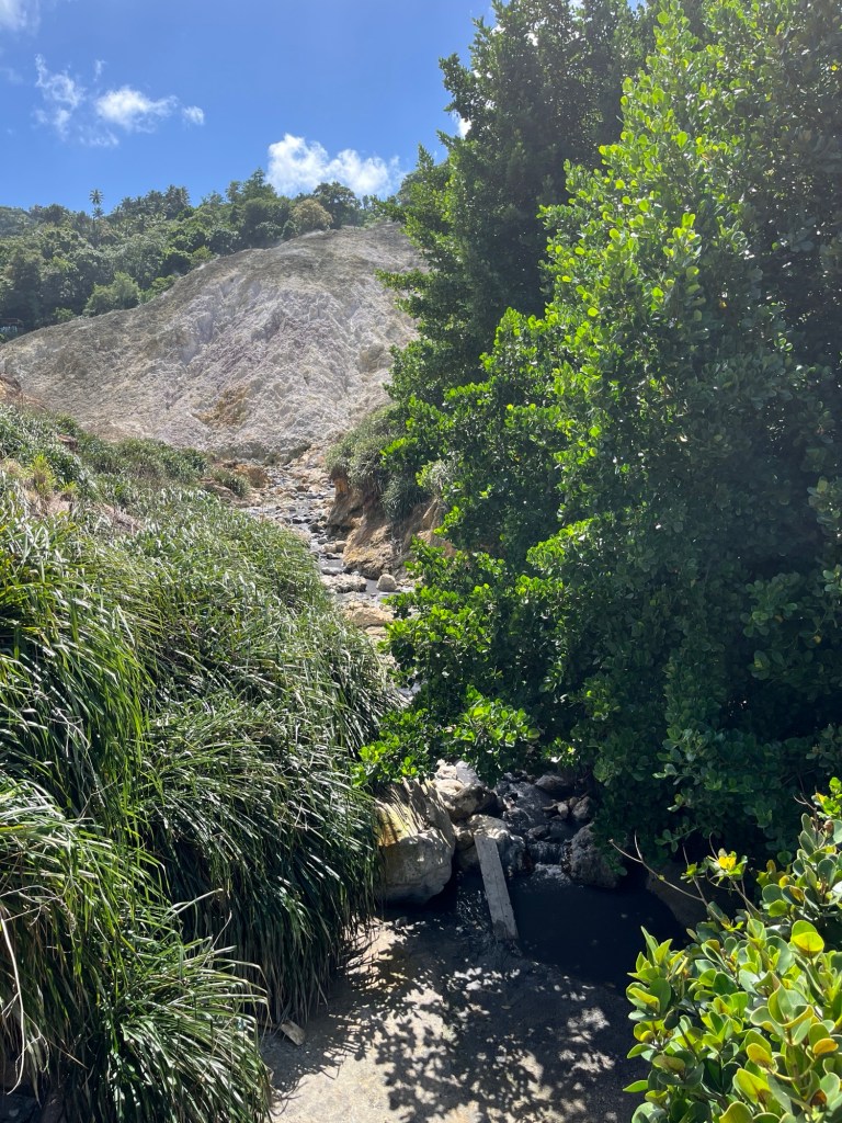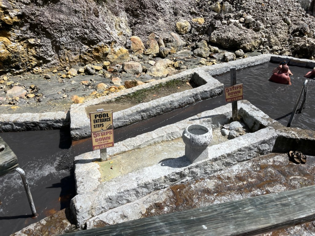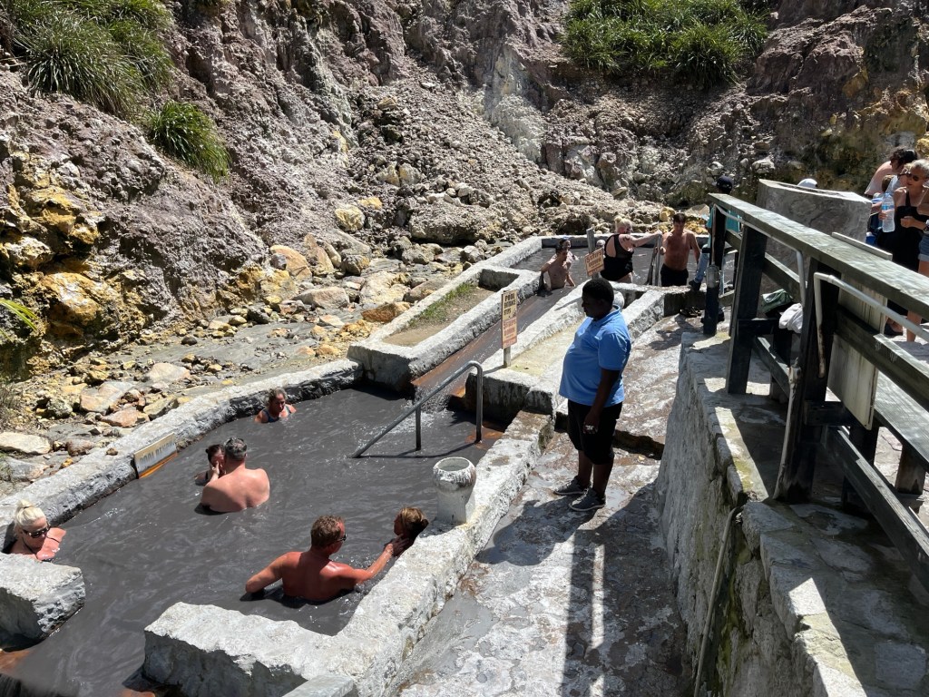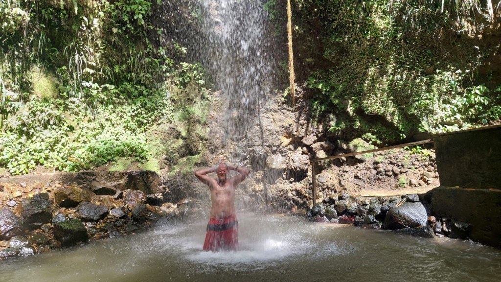 Am nächsten Tag fuhren wir gemeinsam an Land um eine kleine Ausflugstour zu den heißen Schlammquellen und einem Wasserfall zu machen. A’la „Pack die Badehose ein, nimm dein…“ stiegen wir in ein Taxi, dass uns samt Tourguide zuerst durch den Ort Soufriere und dann über mehr oder weniger gut ausgebaute Straßen zu den „Hot Pots“ chauffierte. Diese „Hot Pots“ sind in einer Kaskade arrangierte Wasserbasins, welche aus den heißen, schwefelhaltigen, vulkanischen Quellen der Insel gespeist werden und zusätzlich mit einem schlammigen Sediment durchsetzt sind. Rund um die Becken befinden sich Amphoren, welche hellen und dunklen, gut haftenden Staub enthalten. Mit diesem bedeckt man sich um dann in den wirklich warmen Pools zu verweilen. Dem Heilschlamm wird die Wirkung eines Jungbrunnens nachgesagt und ich denke, ich sehe wieder 10 Jahre jünger aus, das liegt vielleicht aber auch einfach an meinem, zur Freude von Manuela (HiHiHi) immer länger werdenden Kinnbart. Als bekennender Warmduscher und Heißbader hätte ich den ganzen Tag in diesen Pools verbringen können, doch wir wollten noch zu dem Wasserfall weiter.