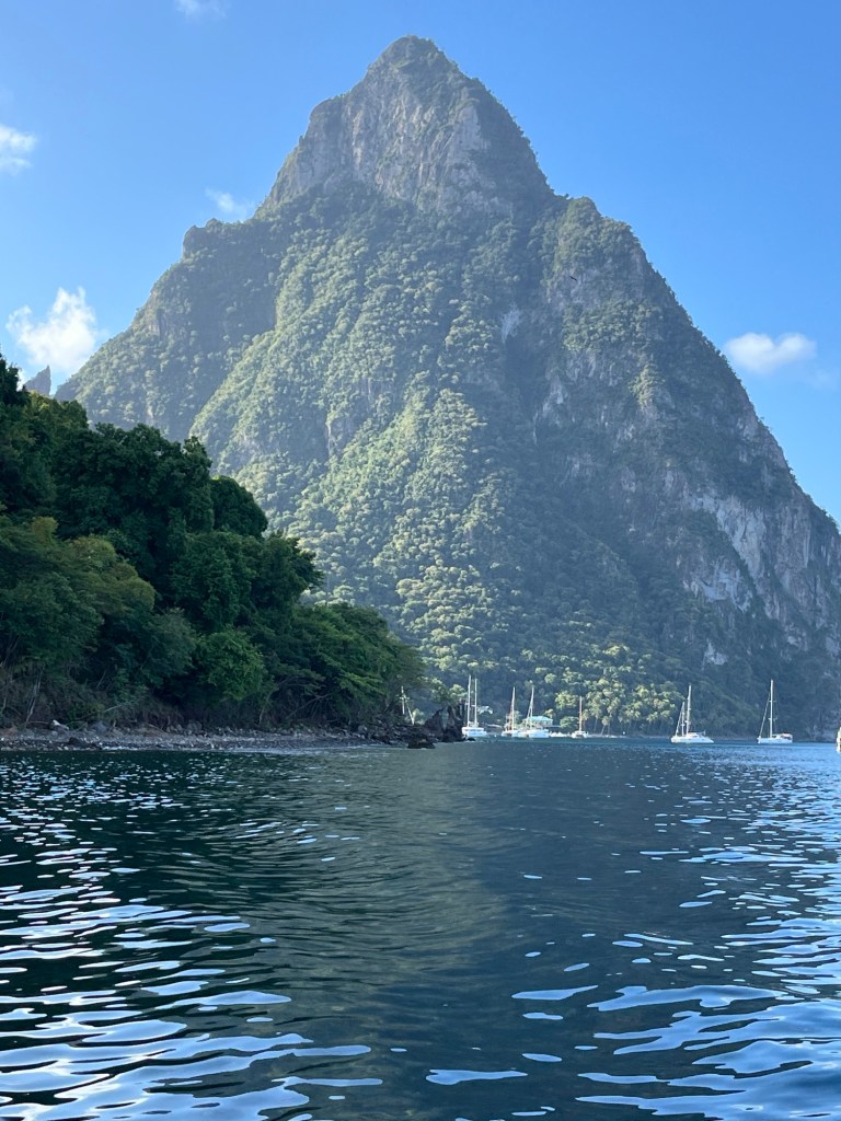 Die weitere Fahrt nach St. Lucia verlief relativ ereignislos. Als die steil aufragenden, grünen Hügel der Küste zu erkennen waren, stellten wir einhellig fest, dass das die Karibik war, die wir uns in unseren Träumen vorgestellt hatten. Schnell holten wir das Handy heraus, riefen den Soundtrack von „Fluch der Karibik“ auf und ergötzten uns im Klang dieser abenteuerlichen Musik an der wilden Landschaft. Wunderschön. Wir erreichten Soufriere Bay an der Westküste von St. Lucia einige Stunden nach der Paloma Grande. Der markante Berg Piton, Namensgeber für ein auf der Insel gebrautes Bier war schon von Weitem zu erspähen. Einige Meilen vor dem Ankerplatz raste uns ein Schlauchboot mit 2 sogenannten Boatboys entgegen. Sie drehten hinter der Inspiration ein und begrüßten uns mit einem herzlichen „Welcome in Paradise!“.