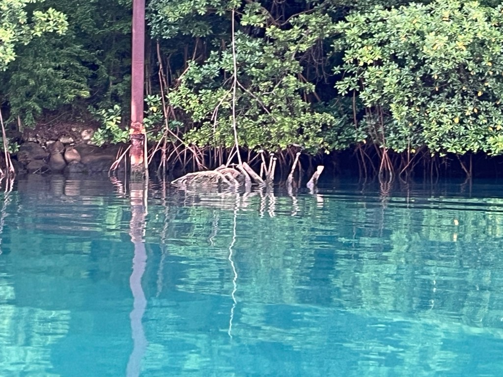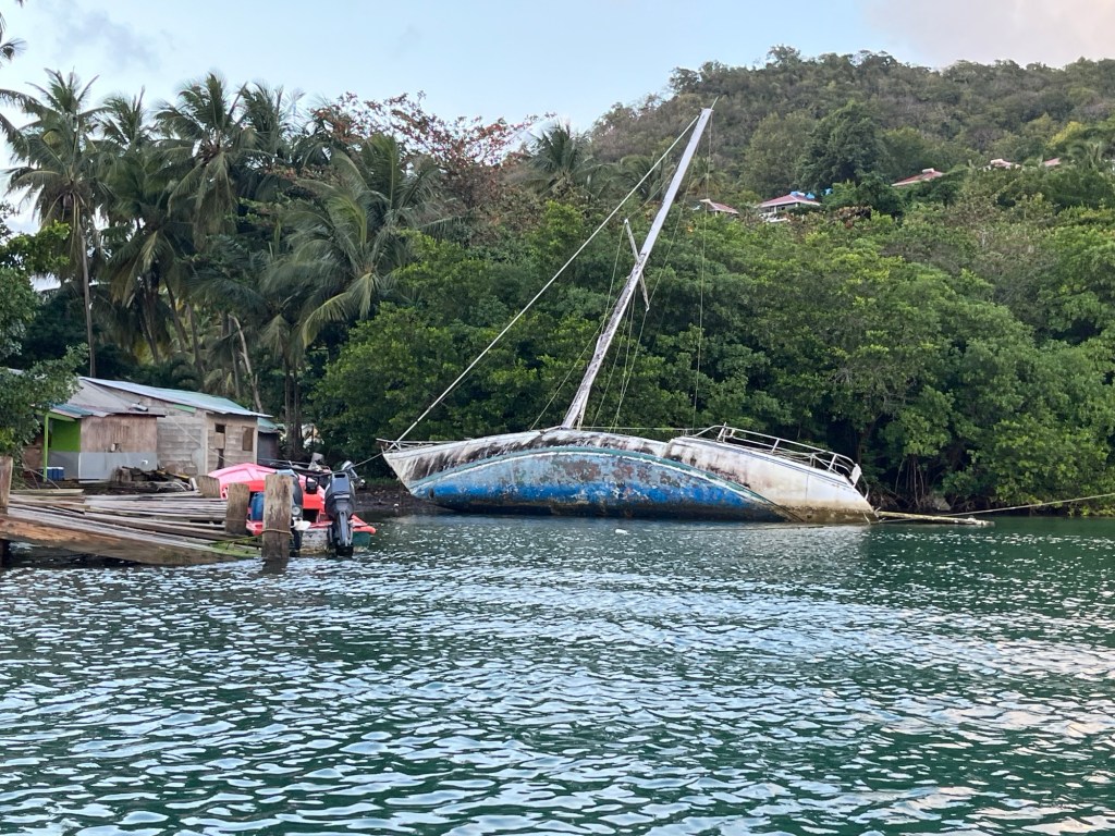 Gegenüber, an dem südöstlichen Ufer der Einfahrt waren Bojen gesetzt, doch hofften wir vor Anker nichts bezahlen zu müssen und so sollte es dann auch sein. Die Paloma Grande hatte den Ankerplatz natürlich vor uns erreicht und sich einen Platz ein wenig weiter ausserhalb gesichert. Einige Stunden vor Sonnenuntergang holten uns Claudi und Uli mit ihrem „Whally“ ab, um gemeinsam die innere, völlig Wind und Wellen geschützte Bucht zu erkunden. Diese fast rundherum geschlossene Bucht wird auch als sogenanntes „Hurricane Hole“ bezeichnet. Ein „Hurricane Hole“ ist ein besonders geschützer Ort, wo man auch einen durchziehenden Hurricane weitgehend sicher abwettern kann. Allerdings haben die jüngsten Hurricanes gezeigt, dass auf diesen Umstand nicht wirklich Verlass ist. Das merkten wir auch, als wir tiefer in das „Hurricane Hole“ vordrangen, denn dort lagen, an den Mangroven verankert, zwei Segelyachten, welche schwere Schäden aufwiesen und wohl aufgeggeben wurden. Die beste Art mit einem Hurricane umzugehen bleibt wohl immer noch, einfach nicht dort zusein. Da sich die Hurricane Saison offensichtlich verändert und im letzten Jahr der erste Wirbelsturm schon im Juni seine verheerende Bahn durch die Karibik zog, werden wir diese Eilande auch schon Ende April verlassen und uns auf den Weg nach Panama begeben.