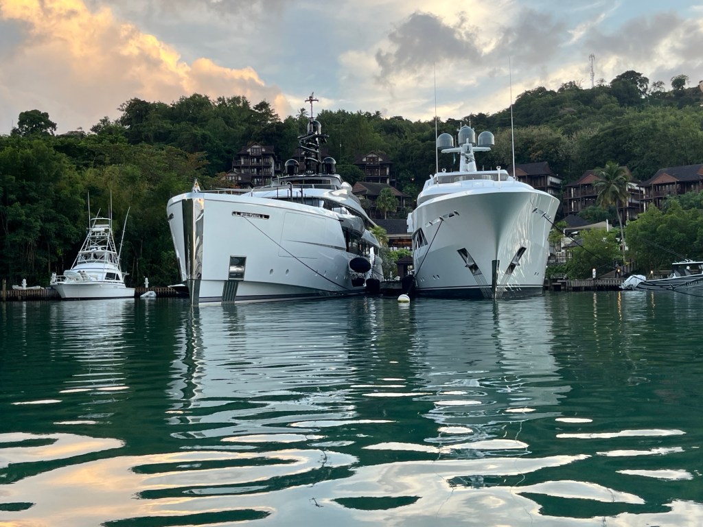 Trotz der Wracks war es ein wunderbarer Ort. An den Docks waren 2 Superyachten vertäut, sowie einige Segelyachten, die sich daneben fast als Beiboote ausnahmen. Zu unserer großen Freude befand sich an der Vorderseite (Westen) der Docks eine Bar, in der sicher auch schon Captain Jack Sparrow den einen oder anderen Rum getrunken hatte und so war es für uns natürlich ein Akt der Seemanns/Seefraus-Ehre, es im gleich zu tun. Das Glück war uns hold und so bestellten wir in den letzten Minuten der „Happy Hour“ acht Cocktails zum Preis von vier (für vier Personen). Wir gesellten uns zu vermeintlich anderen Seglern an einen großen runden Tisch direkt am Wasser, stießen auf unser Glück an und erfreuten uns an der untergehenden Sonne, welche die Bucht in ein magisches Licht tauchte. Ich kam mit den schon am Tisch Sitzenden ins Gespräch. Es stellte sich heraus, dass es gar keine Sgeler waren, sondern zugereiste Bewohner , welche sich hier auf der Insel, in traumhafter Lage oben am Berg, thronend über der Marigot Bay, ein Heim geschaffen hatten. Das Pärchen war aus Maine, USA und war nur im amerikanischen Winter hier. Er zeigte mir auch Bilder von der Überwachungskamera seines Hauses in Maine, auf welchen ein tief verschneiter Pickup in winterlicher Landschaft zu sehen war. Der andere Sitznachbar entpuppte sich als Südafrikaner, der sich entschlossen hatte, hier seinen Lebensabend zu verbringen. Auf die Frage, wie groß denn sein Haus sei, antwortete er ganz trocken :“Not very big, only 5 bedrooms, but with a view over the hole bay; nice little house“.