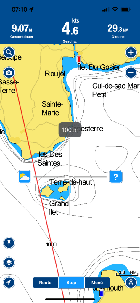Wiedereinmal haben wir von unseren Freunden Uli und Claudi Abschied genommen. Wir sollten mit ihnen auf Guadeloupe einige Wochen danach wieder vereint sein. Die Inspiration und natürlich auch ihre Crew waren fit für ein weiteres Abenteuer, der Überfahrt nach Guadeloupe. Wir lösten die Leine von der Boje 21 der Marina „Etang de Appricots“ und folgten unter Maschine den Fahrwegmarkierungen hinaus aus der Bucht von Fort du France, um so bald wie möglich unter Segel zu gehen. Dieses Mal hatten wir uns entschieden, entlang der Küsten zu segeln, auch wenn wir hier mit vereinzelten Flauten im Lee der Inseln rechnen mussten. Den Umweg, den ich uns durch meine Kurswahl von St. Lucia nach Martinique eingebrockt habe, wollte ich dieses Mal vermeiden und somit die Überfahrt möglichst effizient gestalten.