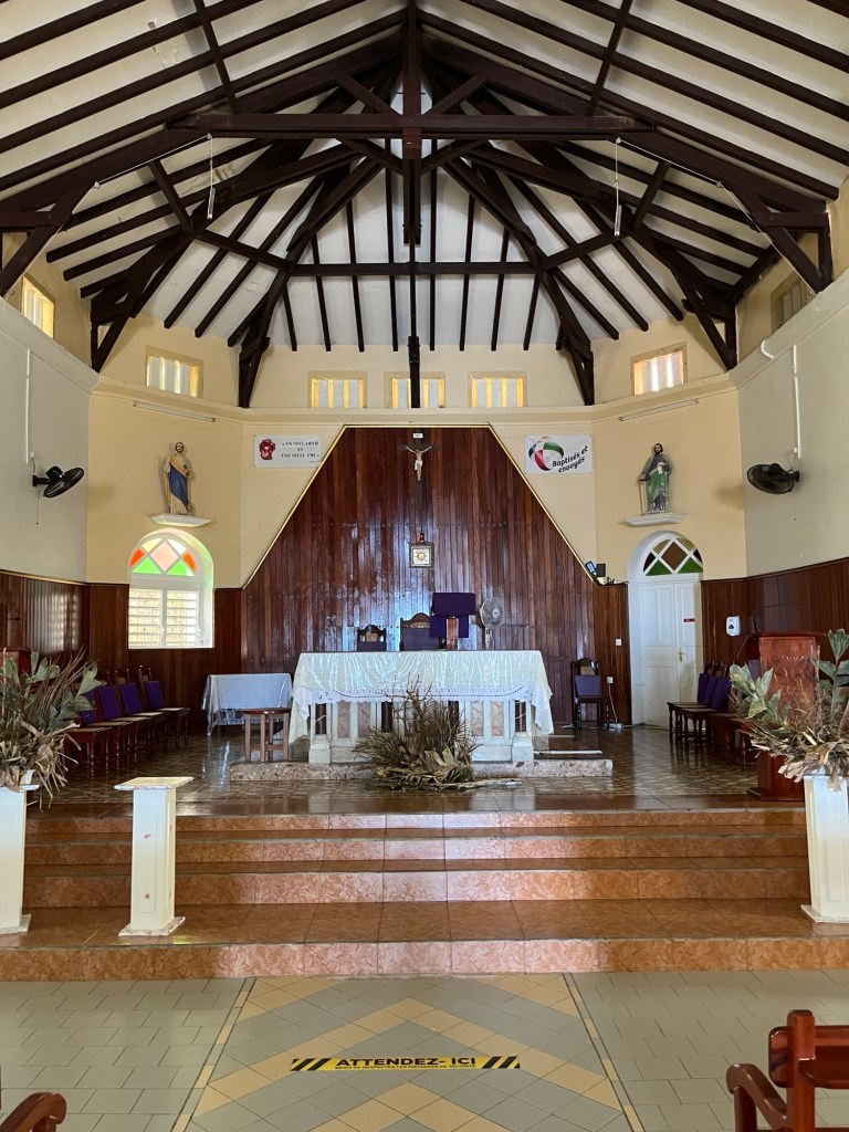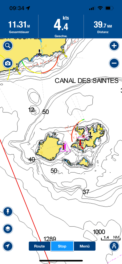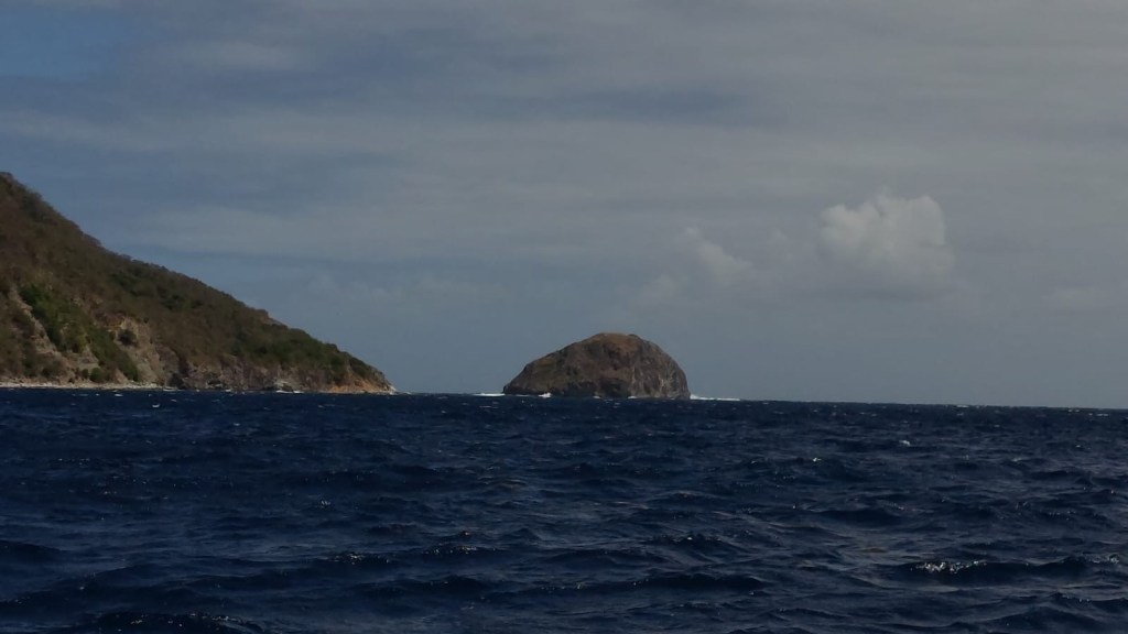 Obwohl wir laut den Vorhersagen mit seitlichem Wind (Halbwind von Steuerbord) rechnen konnten, kam es wieder einmal anders. die Topografie der Inseln kanalisierte den Wind, sodass wir hart am Wind segeln musste. Schließlich hatten wir den Wind vollends von vorn, man sagt „auf der Nase“, was uns uns zwang, die letzten Meilen zu motoren. Am frühen Nachmittag erreichten wir die „Ilets des Saints“, eine wunderschöne, zuweilen abenteuerlich anmutende Inselgruppe südlich von Guadeloupe, politisch zu eben dieser gehörend. Unsere Herbergssuche führte uns zwischen den Inseln durch, um letztendlich auf der nordöstlich gelegenen Insel „Terre du Haut“ in der Bucht „Anse Galet“ unseren Anker zu setzen. („Anse“ bedeutet soviel wie Bucht oder Strand.)