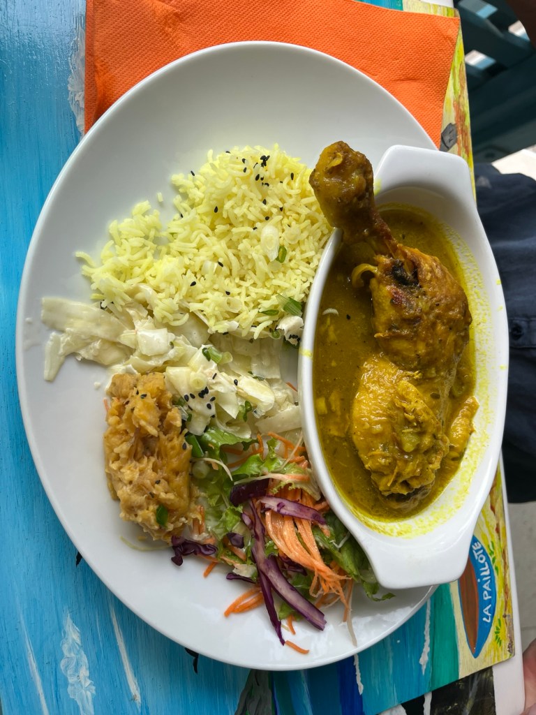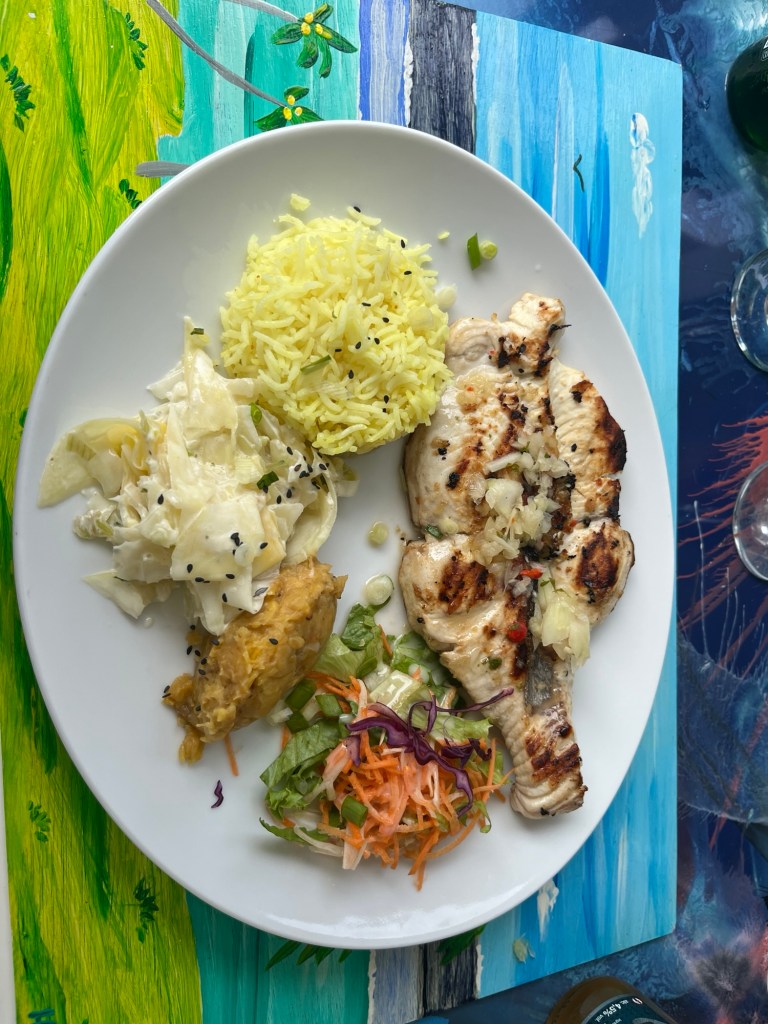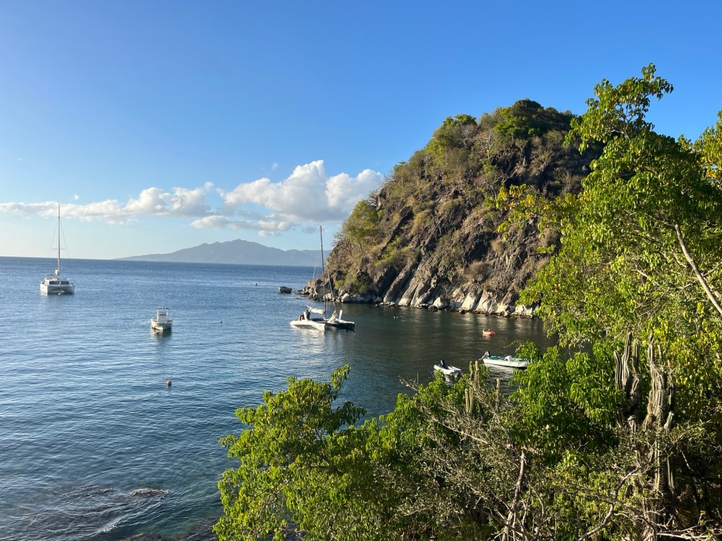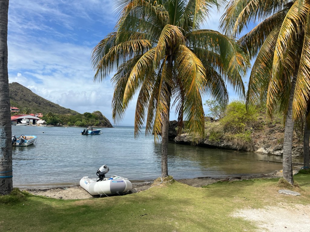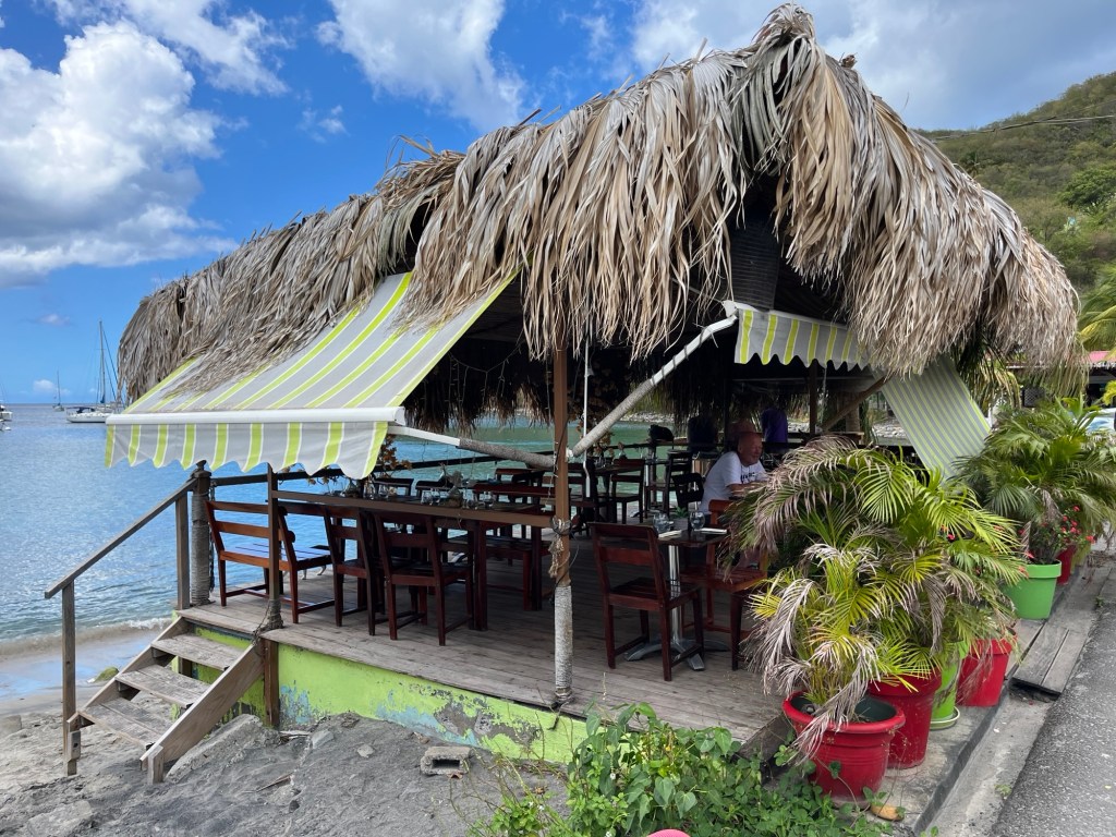 Einige Tage später verlegten wir unseren Liegeplatz in eine, auf der Nordseite gelegene Ankerbucht, fernab vom Trubel rund um die Hauptstadt. Es sollte sich herausstellen, dass dies unser Lieblingsplatz werden sollte, an dem wir eine ganze Woche das karibische Inselfeeling genießen sollten. Am südlichen Ende der Bucht befand sich ein kleines , feines Restaurant, in dem wir im Schatten von Palmen feinen Fisch genossen. Täglich überflog uns eine Formation von französischen „Rafale“ Kampfjets, wobei wir beim ersten Überflug als einziges Boot in der Bucht durch „Flügelwackeln“ begrüßt wurden. Nach einigen Tagen gesellte sich eine kleine, französische Yacht zu uns, welche zwischenzeitlich immer wieder von 6 jungen Leuten bevölkert war.