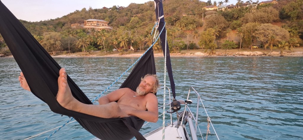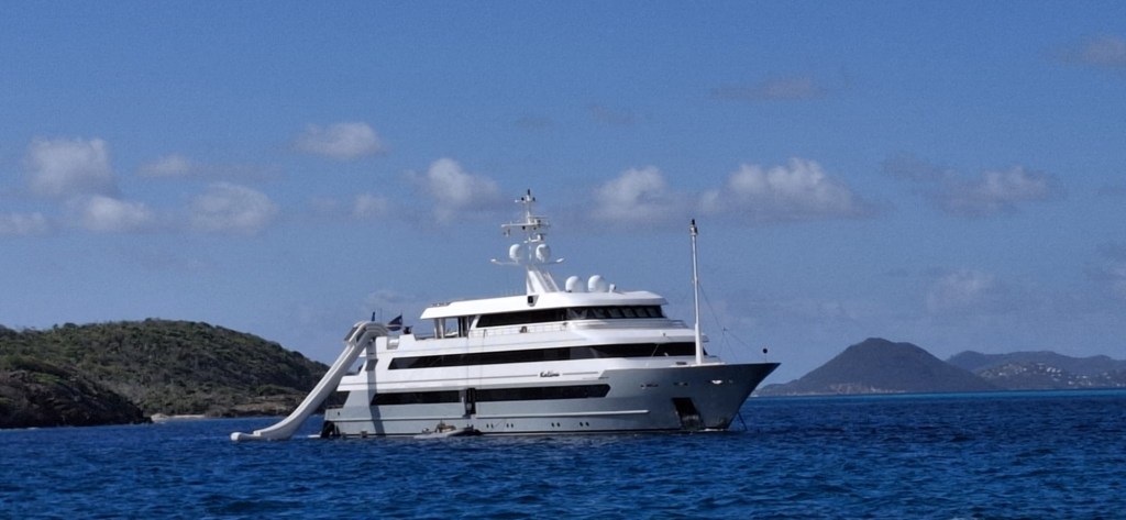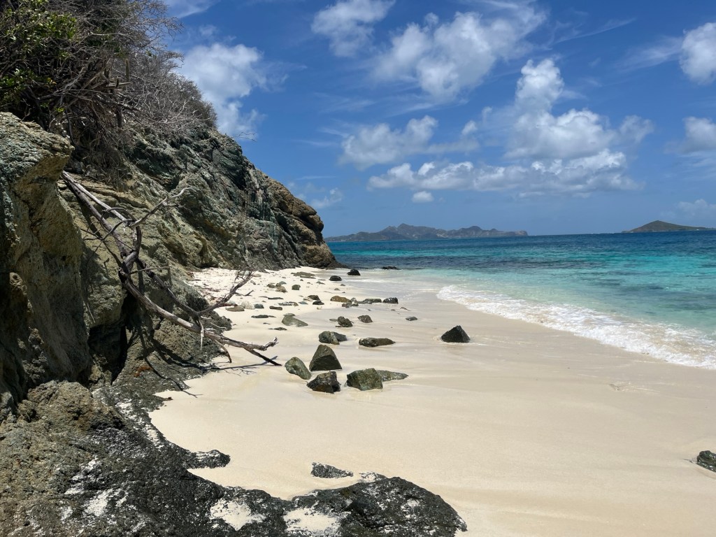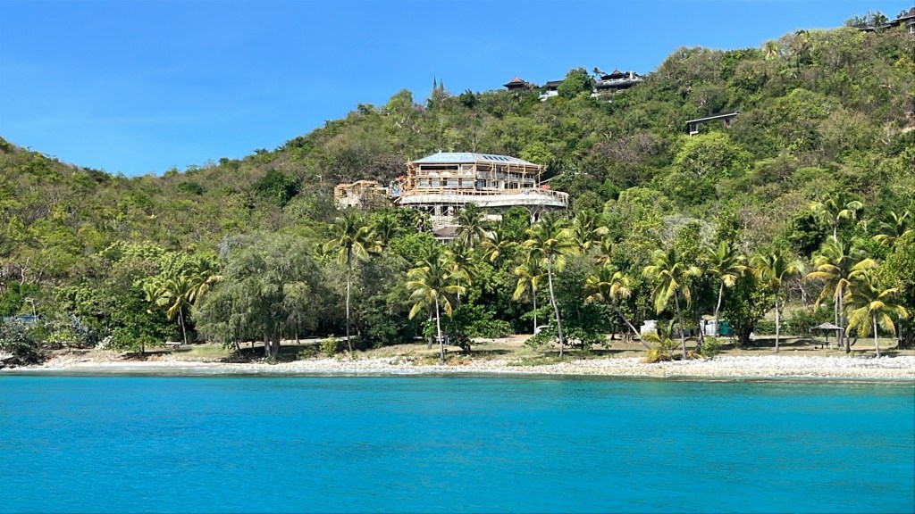 Über Mystique war Unterschiedliches zu Erfahren. Viele Kommentare rieten von einem Besuch ab, denn Mystique war das erklärte Paradies so manchen Superstars und somit nicht uneingeschränkt zugänglich. Es war die Rede von bewachten Stränden und Securities, die verhinderten dass man den opulenten Villen zu nahe kam. Wir nahmen das in Kauf, wollten wir ohnehin nur in der Hauptbucht für einige Nächte vor Anker gehen. Nach einer wunderbaren Halbwind Überfahrt liefen wir am späten Nachmittag in die Brittania Bay ein. Wir sahen dass hier Bojen ausgelegt waren und versuchten mit dem Harbourteam über Funk in Verbindung zu treten, doch wir vernahmen nur das Hintergrundrauschen des Äthers. Manu erblickte ein Boot mit Kurs Inspiration. Es entpuppte sich als das Boot der Bojenverwaltung. Bernhard begrüßte uns herzlich im Paradies und fragte, wo wir denn liegen wollten. Da wir unentschlossen waren, empfahl er eine Boje nahe dem südlichen Ufer, wo wir sicher waren und ruhige Nächte verbringen sollten.