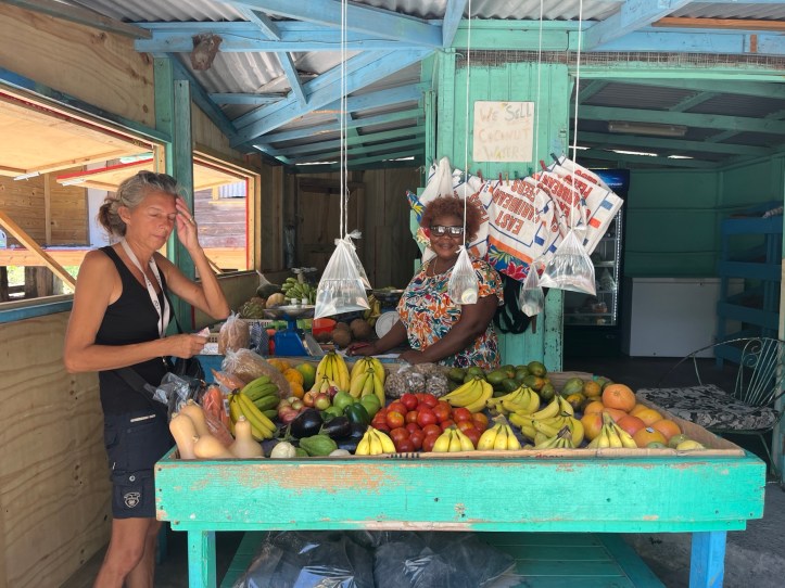 Wir hatten hier natürlich wieder einen Boatboy, welcher uns ständig mit „MAMA und PAPA“ ansprach. „Welcome in Paradise, Mama ! Everything allright, Papa?“ schall es uns entgegen, wenn er mit seinem Boot an uns vorbei düste. Er geleitete uns an die Boje, war uns beim Anlegen am Dinghi Dock behilflich und bot seine Dienste in Bezug auf einen spätere Betankung an. Ein vermeintlicher Fischer kam vorbei und pries den hausgemachten Bananenkuchen seiner Frau an. Da wir das für eine passende Weise hielten, den Menschen hier ein wenig zu helfen, sagten wir nicht nein, auch wenn der Preis, für den wirklich köstlichen Kuchen herausfordernd war. In der Folge sollten wir noch lernen, dass hier alles wesentlich teurer ist als anderswo, ja sogar kostspieliger als auf der Promi Insel Mystique.